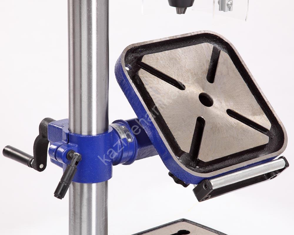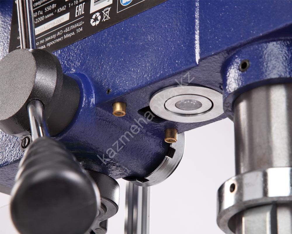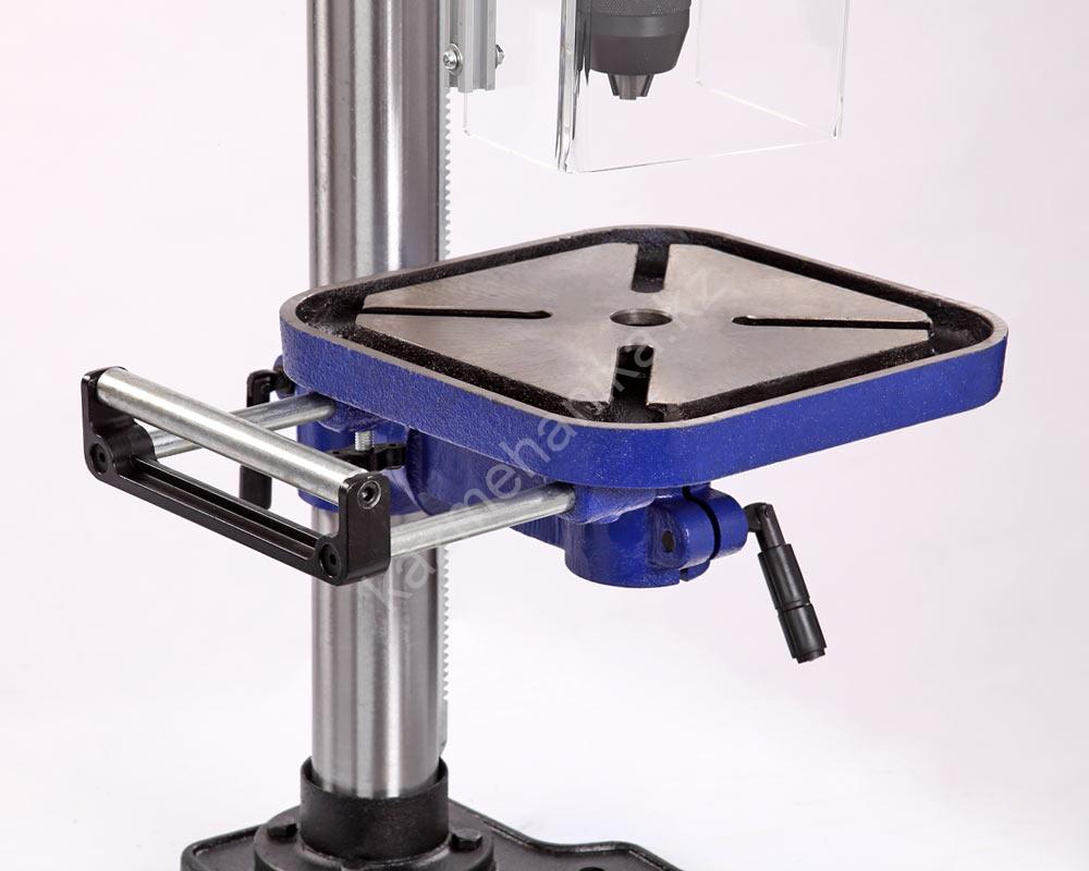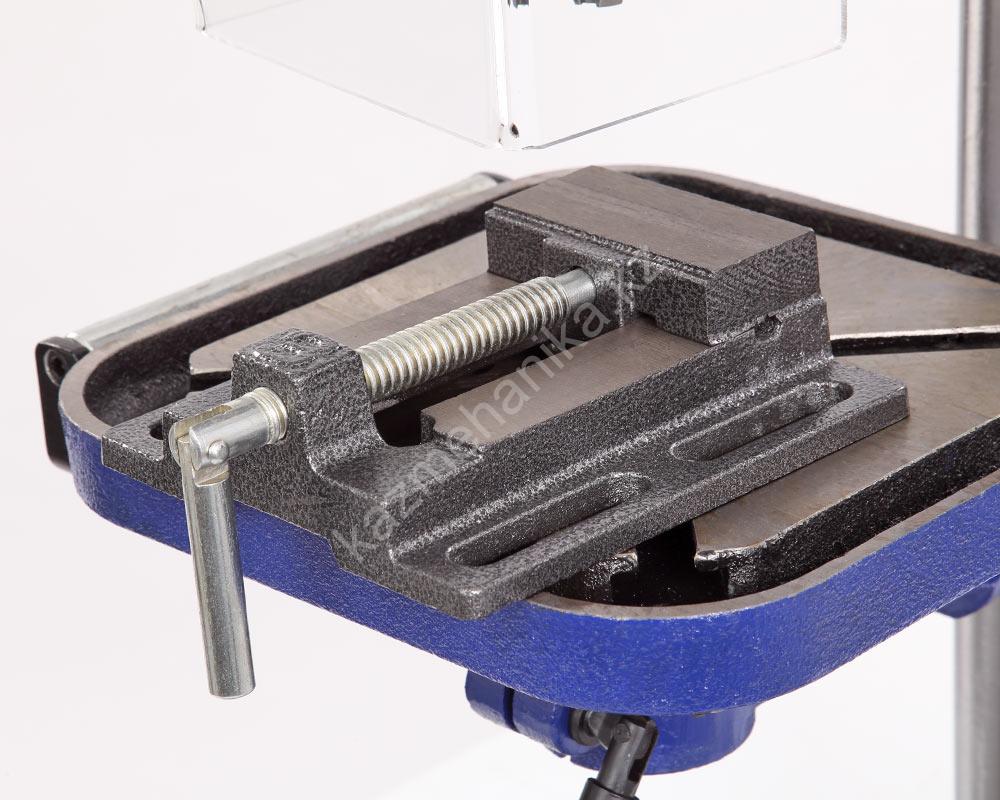 В комплекте предусмотрены тиски. Для их крепления есть четыре паза на рабочем столе и два на основании. Шкала, показывающая ход пиноли шпинделя, расположена слева от панели управления станком, возможно ограничение хода пиноли, путем перемещения стопора по планке. Наконечники тройной рукояти удобной формы, что способствует плавной подаче сверла к заготовке. максимальный ход пиноли шпинделя 90 мм.