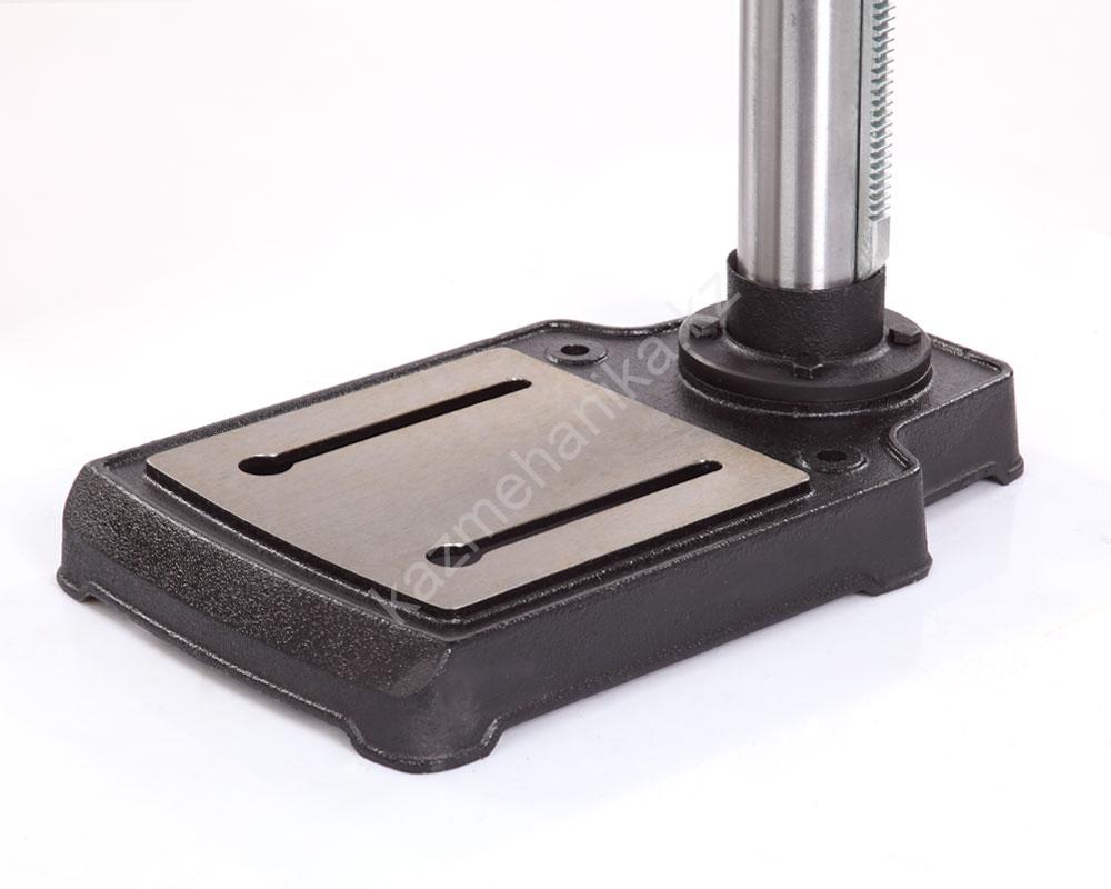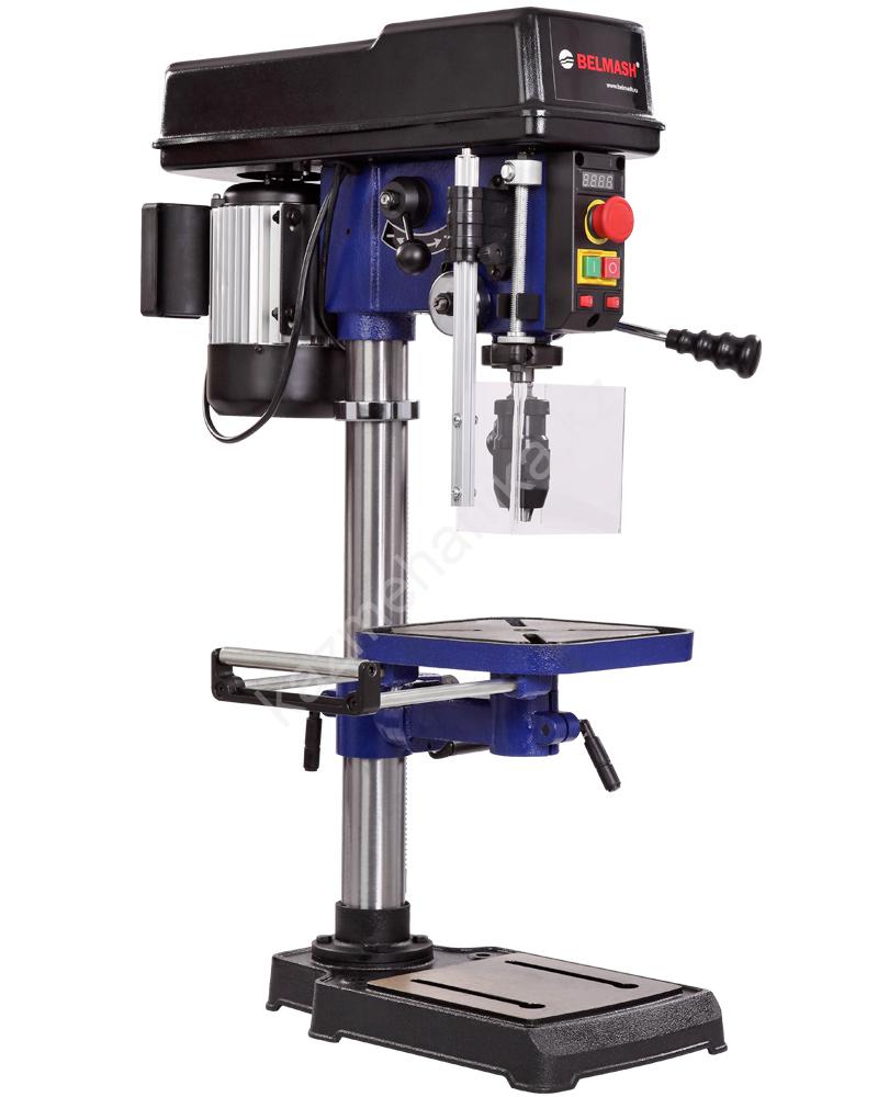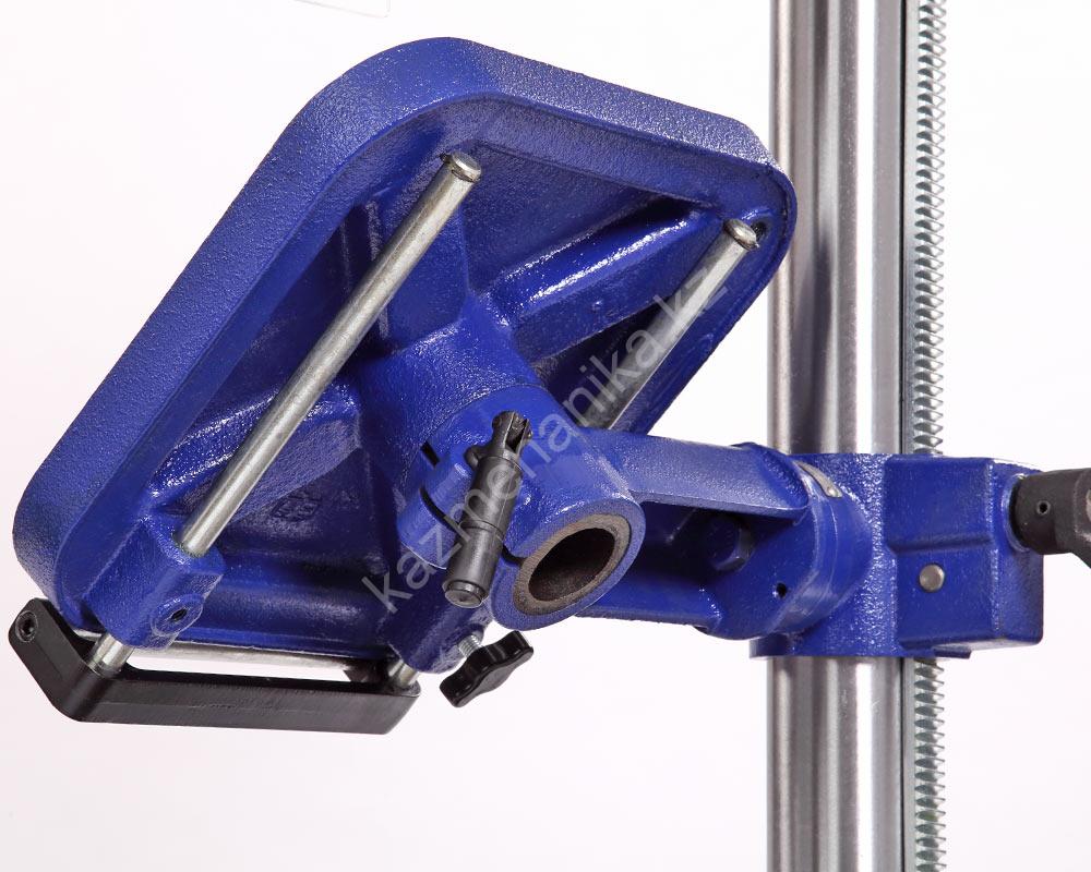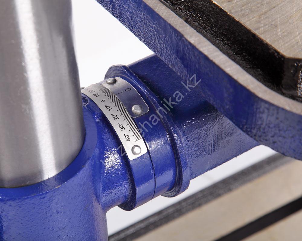В комплекте предусмотрены тиски. Для их крепления есть четыре паза на рабочем столе и два на основании. Шкала, показывающая ход пиноли шпинделя, расположена слева от панели управления станком, возможно ограничение хода пиноли, путем перемещения стопора по планке. Наконечники тройной рукояти удобной формы, что способствует плавной подаче сверла к заготовке. максимальный ход пиноли шпинделя 90 мм.
