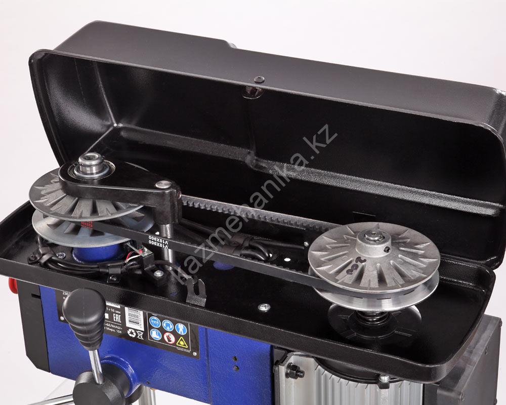 Станок, благодаря вариатору имеет диапазон скорости вращения шпинделя от 340 до 2200 об./мин., что необходимо при выполнении различных операций и типах материала. регулировка производится за счет перемещения положения рукоятки, расположенной на левой стороне сверлильной головы.