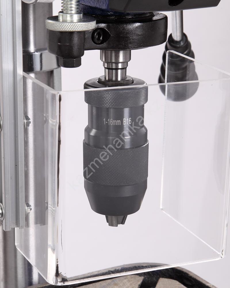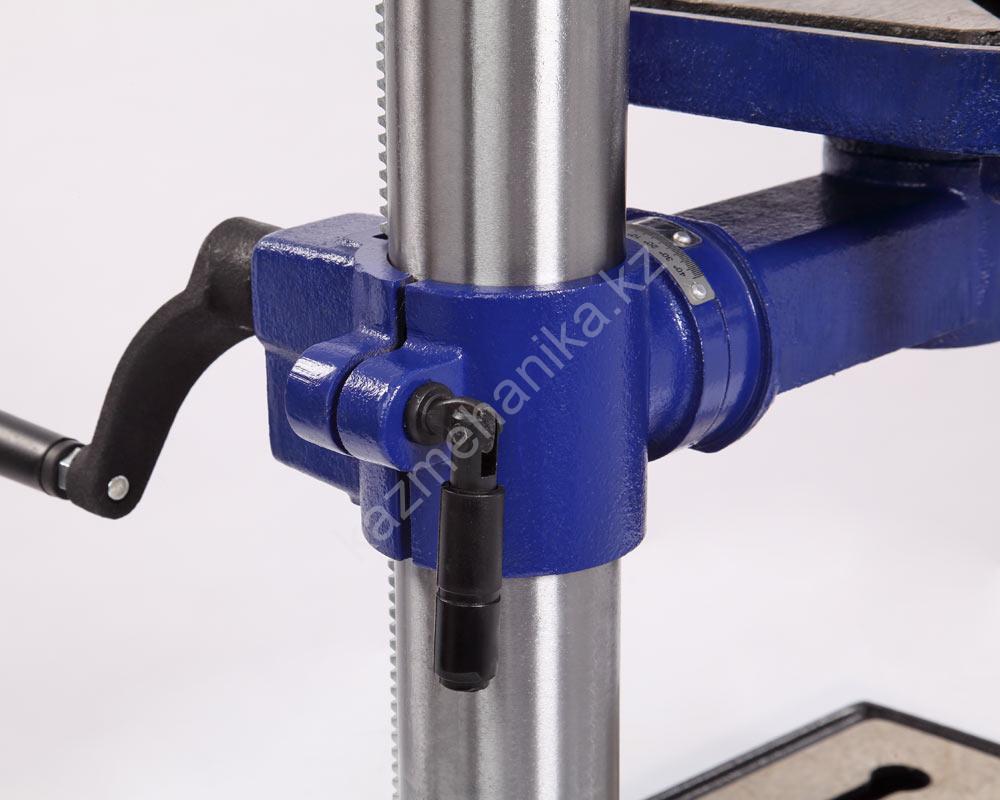 Патрон быстрозажимной с максимальным диаметром зажимаемого хвостовика инструмента 16 мм. Диаметр стойки (колонны) 60 мм, имеется зубчатая рейка, поднятие/опускание стола настраивается с помощью рукоятки.