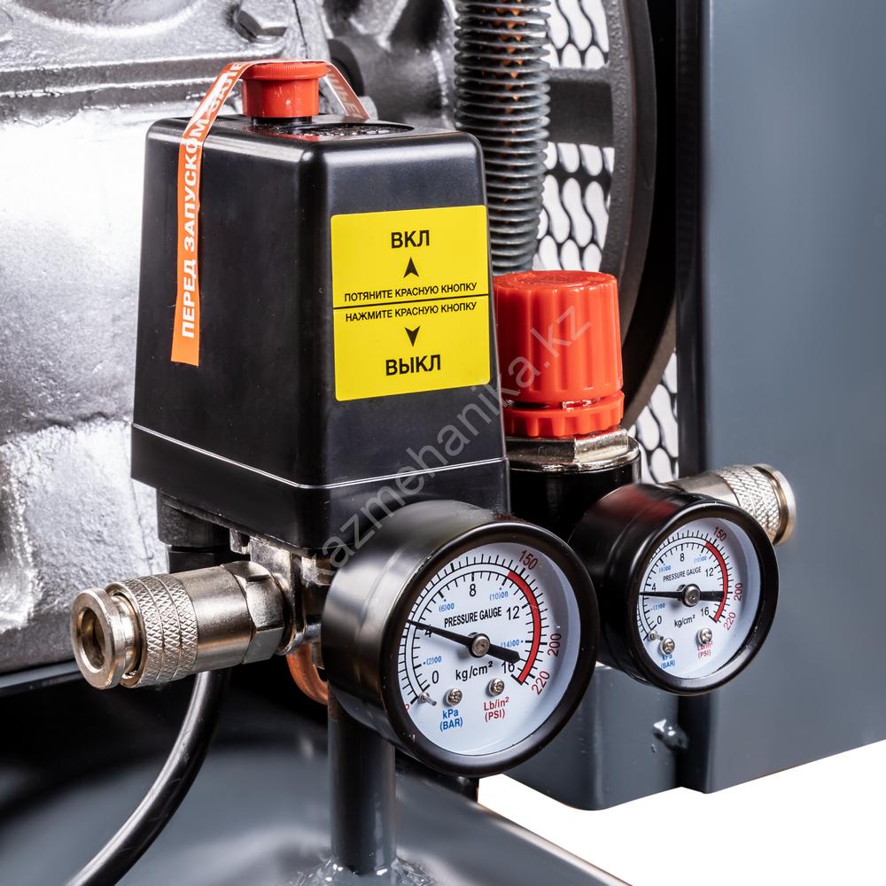 FTL 440/50 HP — Воздушный двухпоршневой масляный компрессор с ременным приводом. Отличается высокой производительностью в 440 л/мин благодаря использованию компрессорной головки с двумя цилиндрами, при этом, ременной привод компрессора обеспечивает низкую степень вибраций, меньший нагрев и уровень шума, что гарантирует повышенную надежность и увеличенный срок службы. Данный компрессор может широко применяться как в быту, так и на небольшом производстве, и в автомастерских. Версия HP – отличается повышенным рабочим давлением в 10 бар, что позволяет использовать еще больший перечень пневмоинструмента. Оптимальными областями применения являются работы по нанесению лакокрасочных покрытий, грунтов, антикоррозионных покрытий. Работа с шлифовальным пневмоинструментом, гайковертами и т.п. Накачка шин. Опрессовка и удаление воды из систем водоснабжения и отопления. Продувка и очистка от пыли и грязи. Пескоструйная обработка поверхностей. Модель оснащена двумя быстросъемными выходами, автоматическим реле давления с манометром, а также регулятором для установки требуемого выходного давления с дополнительным манометром для его контроля под рабочие параметры подключаемого пневмоинструмента. Защитный кожух ременного привода предотвращает его повреждение и обеспечивает безопасную эксплуатацию. Наличие аварийного (перепускного) клапана и крана для слива конденсата упрощают обслуживание модели. Также компрессор оснащен колесами с резиновым покрытием которые позволяют его удобно перемещать и дополнительно гасят вибрацию при его работе.