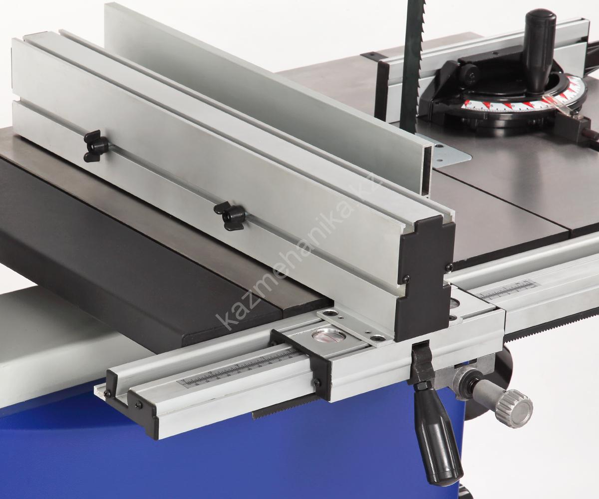 Основной стол выполнен из чугуна. Он имеет угол наклона от -5 до +45 градусов. Для работы с большими заготовками в комплектации предусмотрено расширение из листовой стали, общий размер рабочей поверхности в итоге составляет 660х450 мм. На передней направляющей с помощью эксцентрикового зажима закрепляется параллельный упор с системой точной подстройки. Она оснащена шкалами в миллиметрах и дюймах для точного позиционирования. Параллельная направляющая может устанавливаться как вертикально, так и горизонтально, в зависимости от высоты заготовки. На основном столе имеется два Т-образных паза стандартного размера 19х9,5 мм (по обе стороны от полотна) для углового упора (-60…+60 град.).