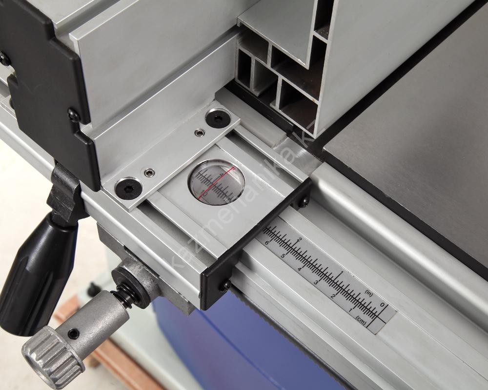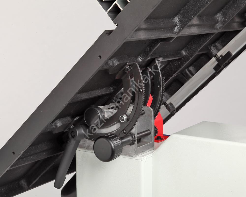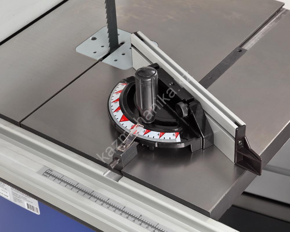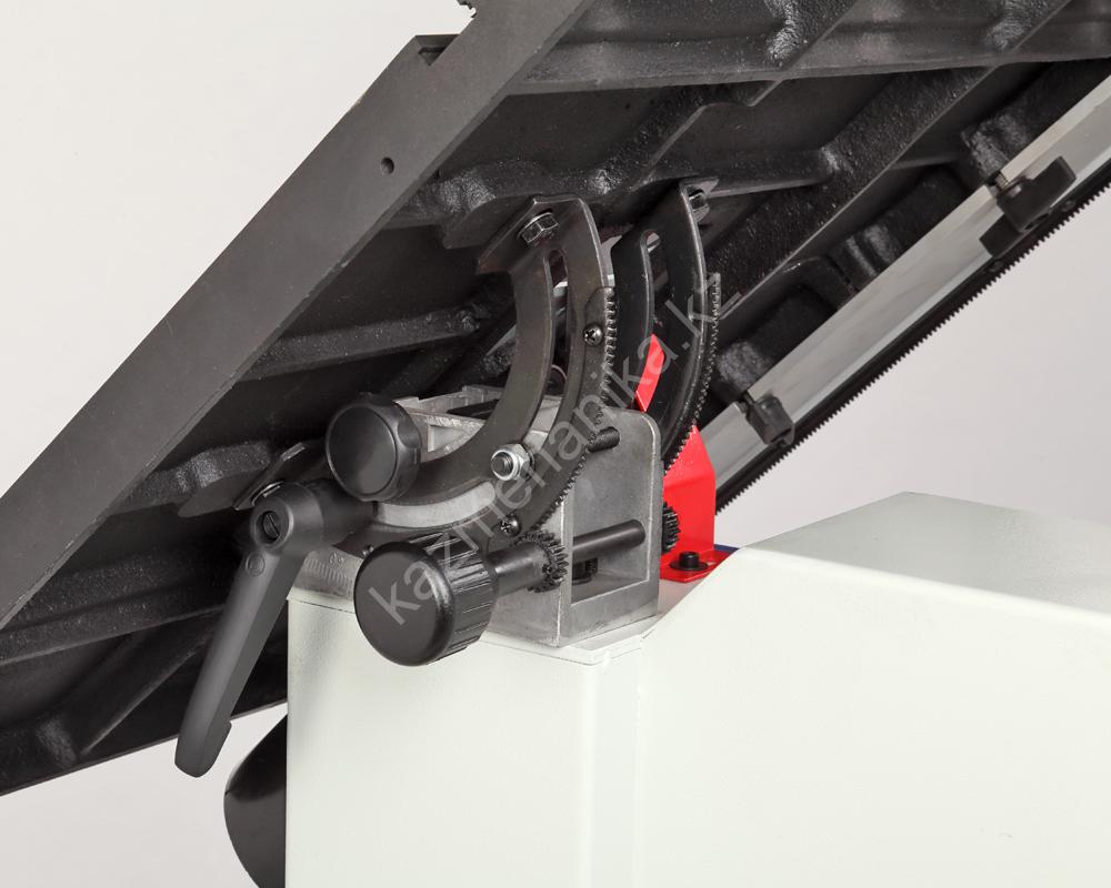 Основной стол выполнен из чугуна с углом наклона от -5 до +45 градусов. Для работы с большими заготовками предусмотрено расширение из листовой стали, общий размер рабочей поверхности в итоге составляет 730х480 мм. На передней направляющей с помощью эксцентрикового зажима закрепляется параллельный упор с системой точной подстройки. Эта направляющая оснащена шкалами в миллиметрах и дюймах для точного позиционирования. Параллельная направляющая может устанавливаться как вертикально, так и горизонтально, в зависимости от высоты заготовки. На основном столе имеется два Т-образных паза стандартного размера 19х9,5 мм (по обе стороны от полотна) для углового упора (-60…+60 град.).