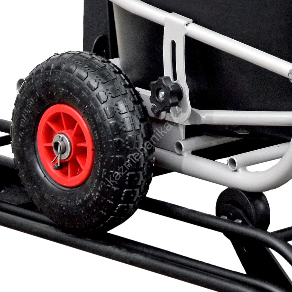 Тележка оборудована пневматическими колёсами, что даёт высокую проходимость и позволяет легко перемещать ёмкость с полной загрузкой по рабочей площадке. Колёса с камерой – 4.10/3.50-4. Точность установки тележки на станцию достигается за счет направляющих роликов и ограничительных захватов.