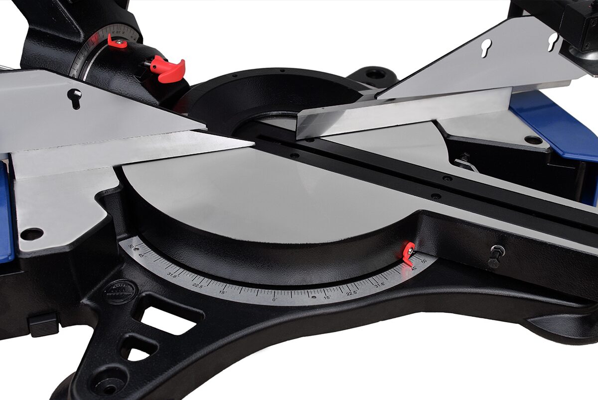 Пильный узел наклоняется на 47° по вертикали влево или вправо, с жесткими упорами в 0°, 22.5°, 33.9° и 45°.