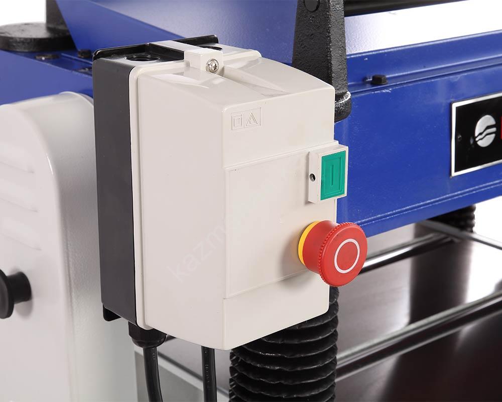 Пусковое устройство расположено в удобном для оператора месте — сбоку от строгального механизма. Оно оснащено кнопкой аварийной остановки станка.
