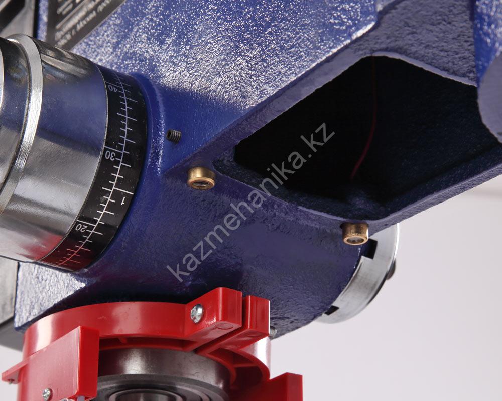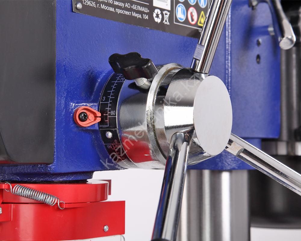 В комплекте предусмотрены тиски. Для их крепления есть четыре паза на рабочем столе и два на основании. Шкала, расположенная на рукоятке регулировки глубины сверления, показывает ход пиноли шпинделя, с ее помощью можно настраивать ход пиноли, для этого необходимо провернуть шкалу, стрелка на корпусе будет показывать значение, на которое будет возможно погружение сверла, затем затянуть барашек. Наконечники тройной рукояти удобной формы, что способствует плавной подаче сверла к заготовке. Для точного позиционирования станок оснащен лазером — указателем.