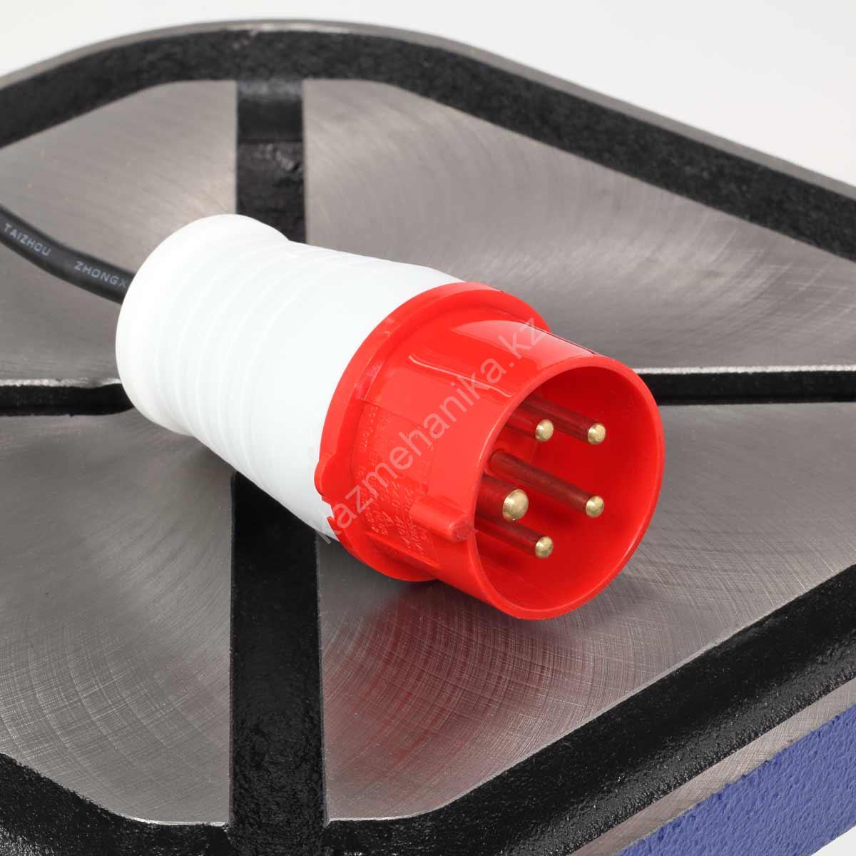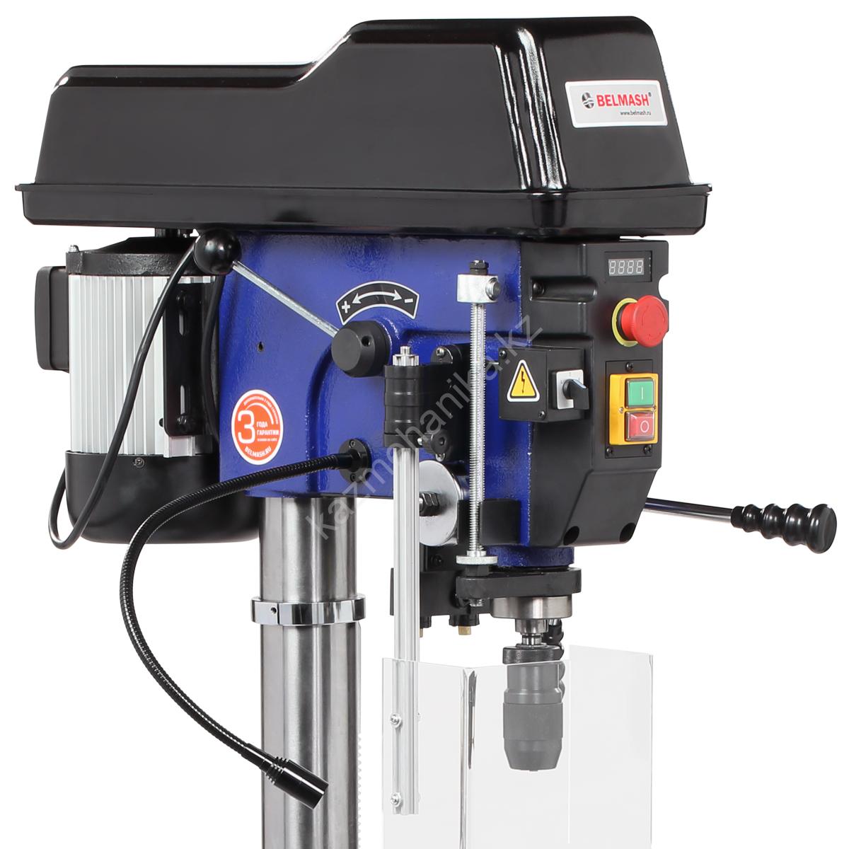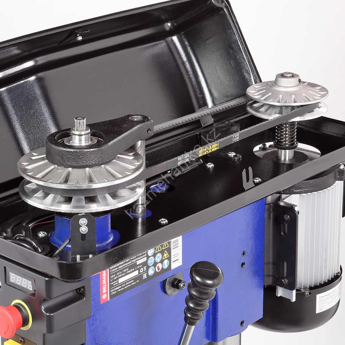 Двигатель асинхронный, мощный, 1500 Вт. Подключение к сети 400 В. Благодаря вариатору станок имеет диапазон скорости вращения шпинделя от 440 до 2100 об./мин., что необходимо при различных операциях и материалах. Рукоятка регулировки выведена на левый торец сверлильной головки.