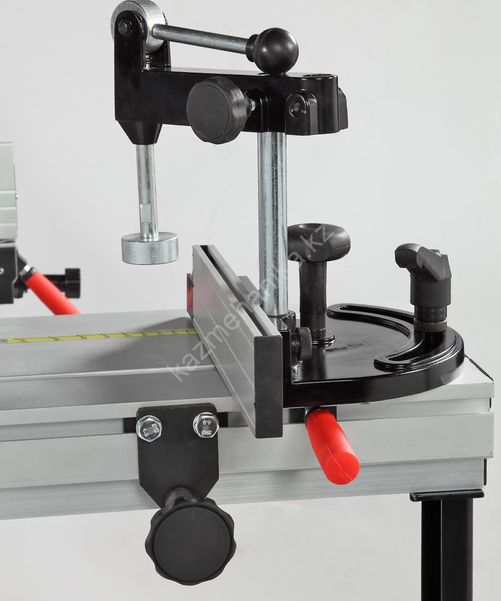 Станок оснащен основным чугунным столом, двумя дополнительными секциями из листовой стали, подвижным столом из алюминиевого профиля и столом поперечного реза из стального профиля. Основной и подвижный столы имеют по одному пазу для установки угловых упоров или дополнительных приспособлений.