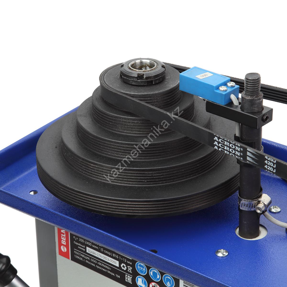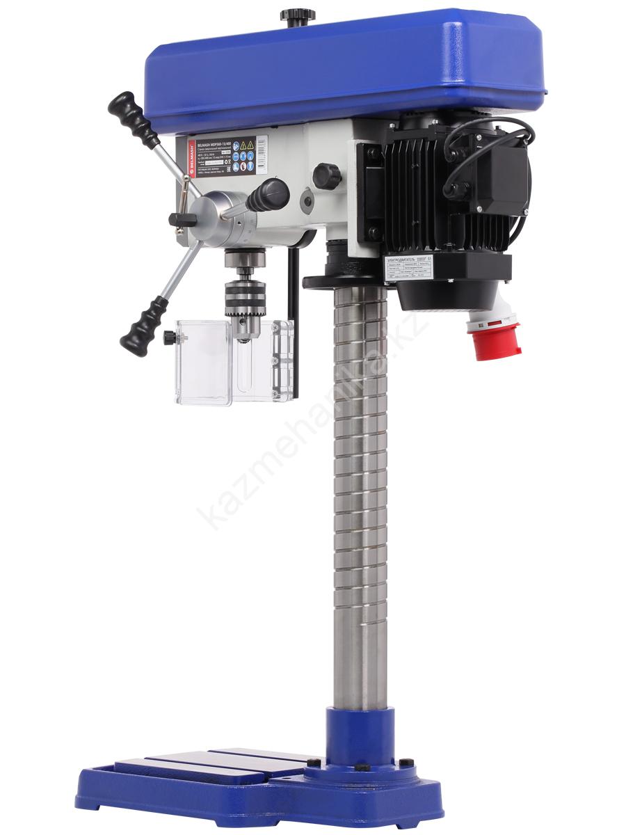 Станок способен сверлить отверстия с максимальным диаметром до 13 мм (в металле) и до 50 мм (в древесине). Патрон ключевой трехкулачковый, с возможностью установки инструмента с хвостовиком до 13 мм. Вращающий момент с вала двигателя на шпиндель передается с помощью клиноременной передачи. Скоростей у данной модели пять: 200, 580, 960, 1550 и 2400 об./мин. Изменить частоту вращения можно переброской ремня на нужную ступень шкивов.