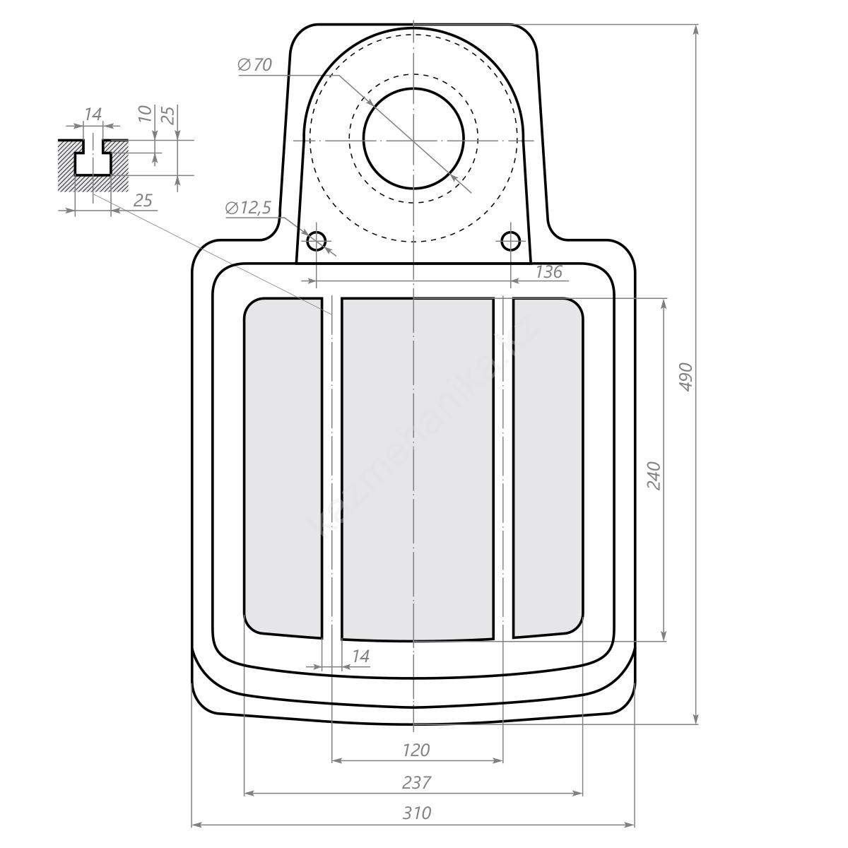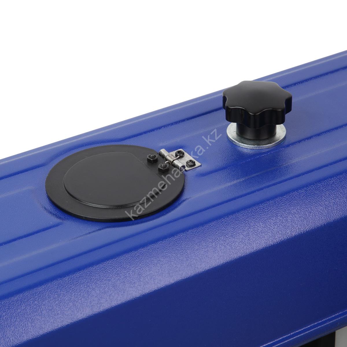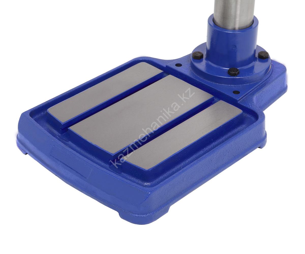 Основание станка чугунное. Оно в данной модели является и рабочим столом, габаритные размеры — 310×490 мм, рабочая поверхность — 237×240 мм. На нем предусмотрены два Т-образных паза для установки тисков или других зажимных приспособлений (в комплект поставки не входят).