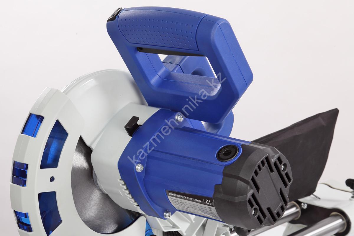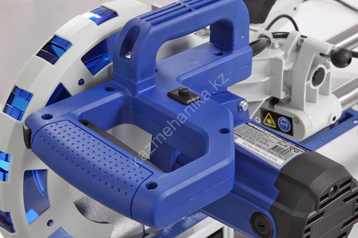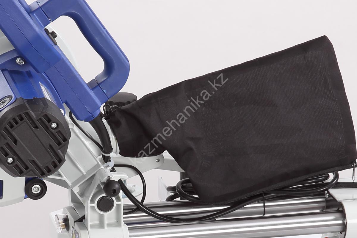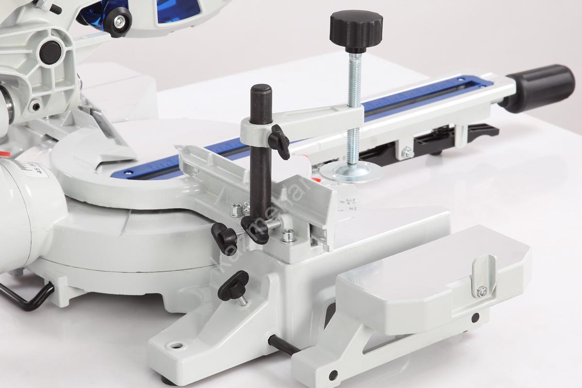 Для дополнительной точности реза предусмотрена лазерная направляющая. В комплекте есть струбцина для фиксации заготовки. Режущая головка с автоматически закрывающимся защитным кожухом. Патрубок для отвода отходов резания позволяет подключить вытяжное устройство.