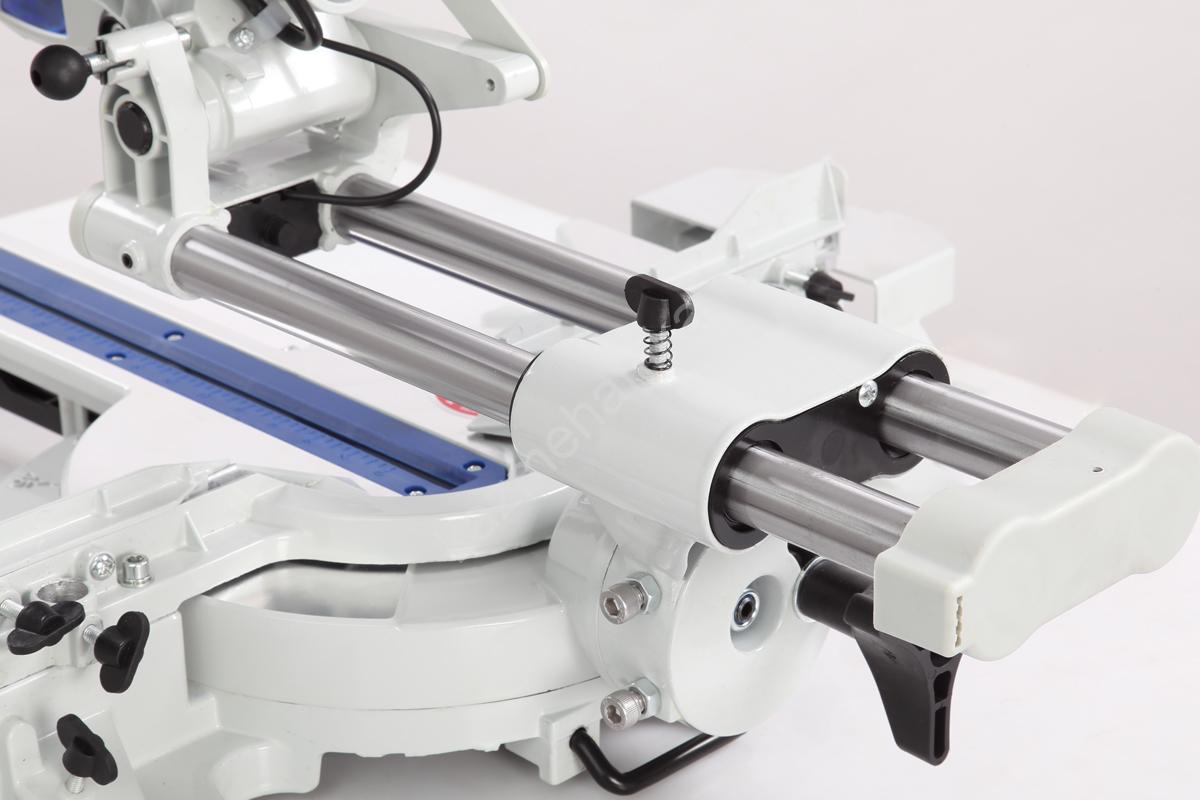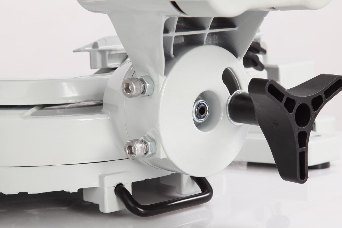 Пильный узел оснащен механизмом протяжки (горизонтальное перемещение), который обеспечивает продольный ход пильной части, благодаря чему ширина пиления увеличена. Угол наклона пильного узла до 45 градусов влево. Стол поворотный, имеет два удлинения. Специальный сплав обеспечивает легкость и прочность конструкции.