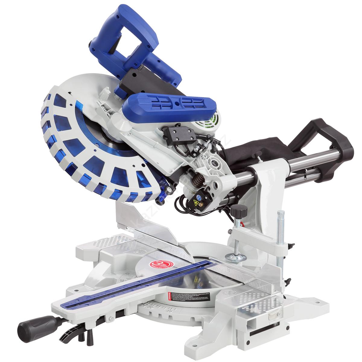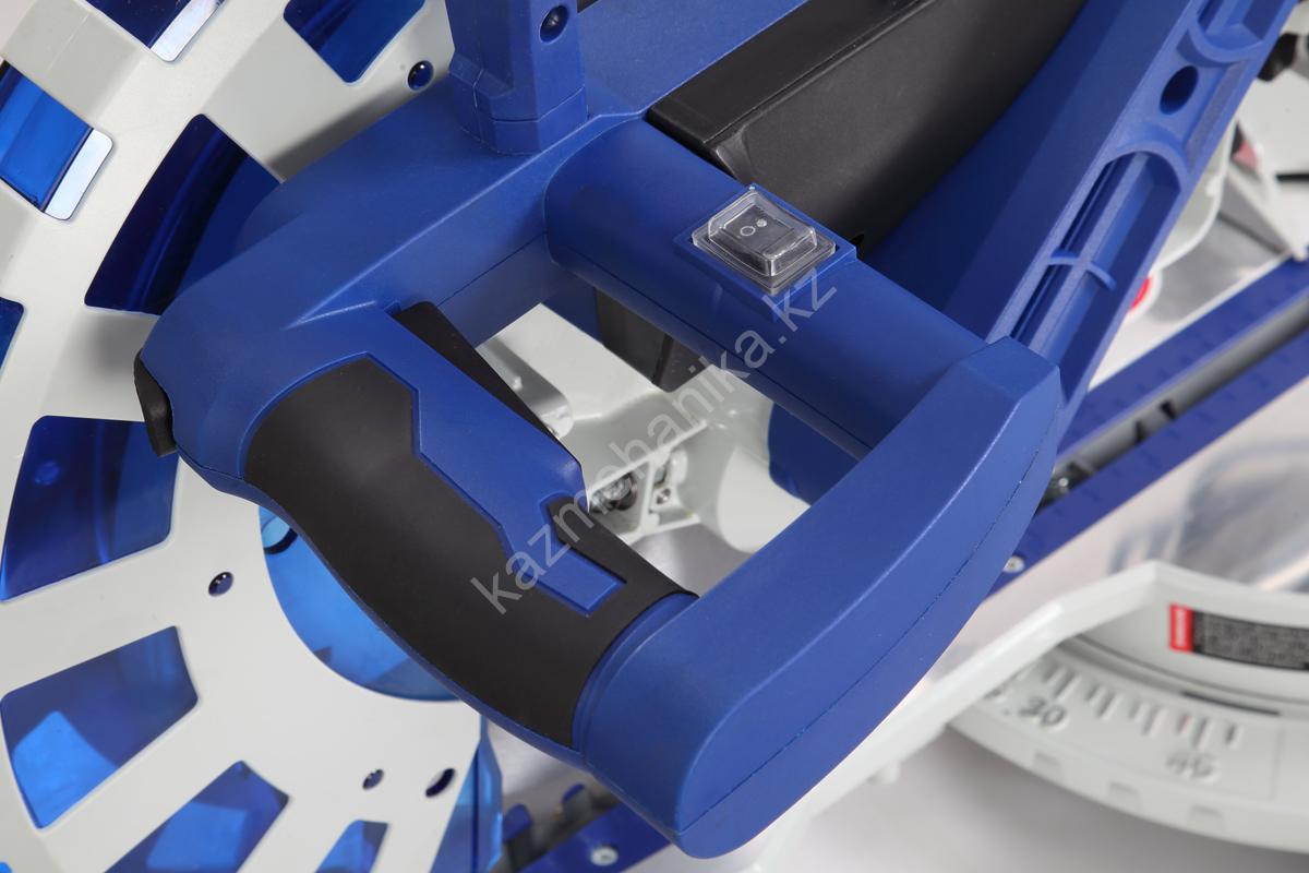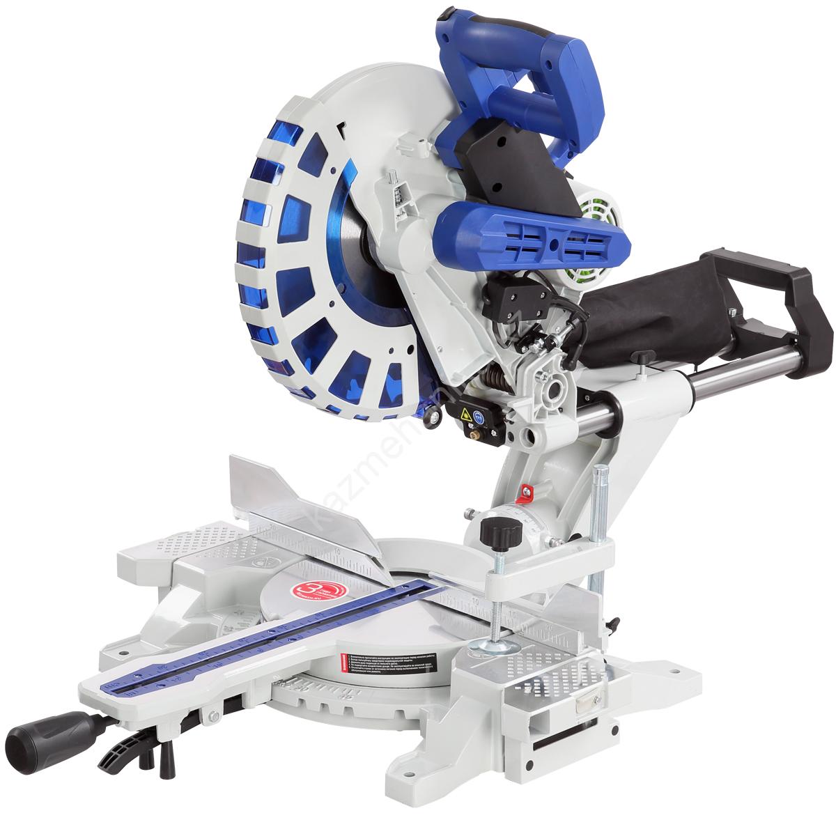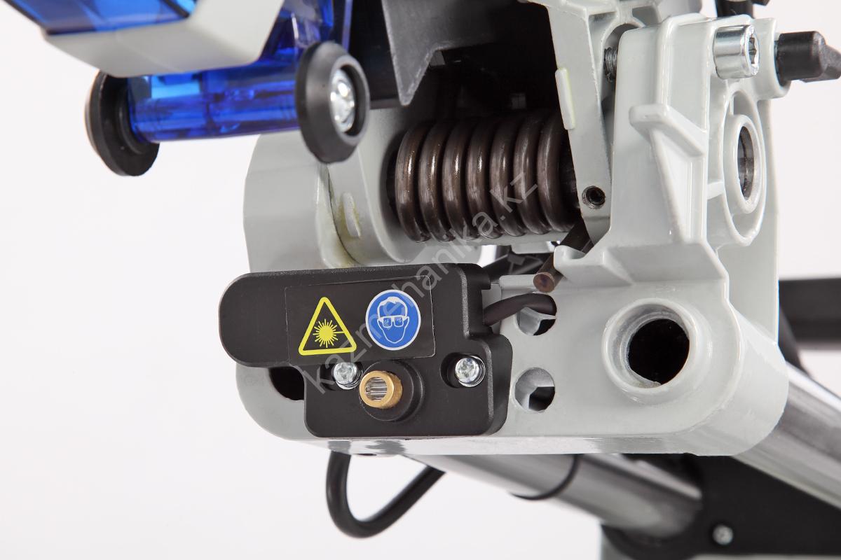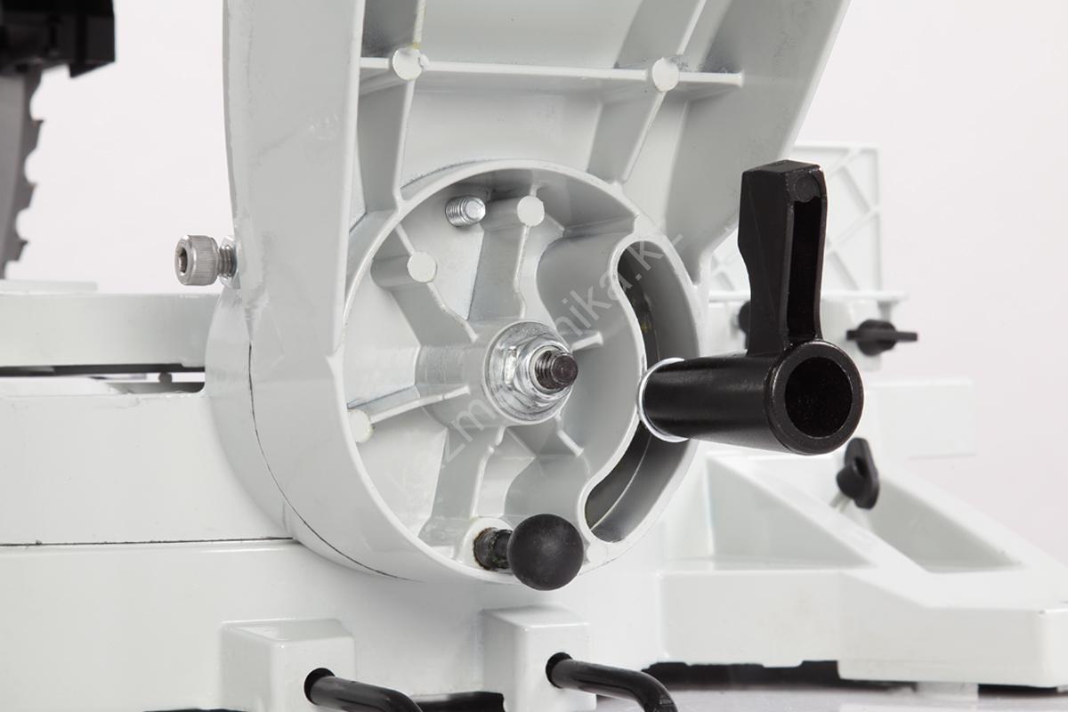 Стол поворотный, имеет два удлинения. Специальный сплав обеспечивает легкость и прочность конструкции. Для дополнительной точности реза предусмотрена лазерная направляющая. В комплекте есть струбцина для фиксации заготовки. Режущая головка с автоматически закрывающимся защитным кожухом. Патрубок для отвода отходов резания позволяет подключить вытяжное устройство.
