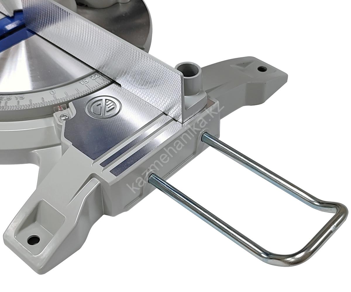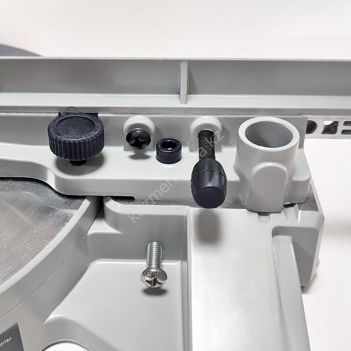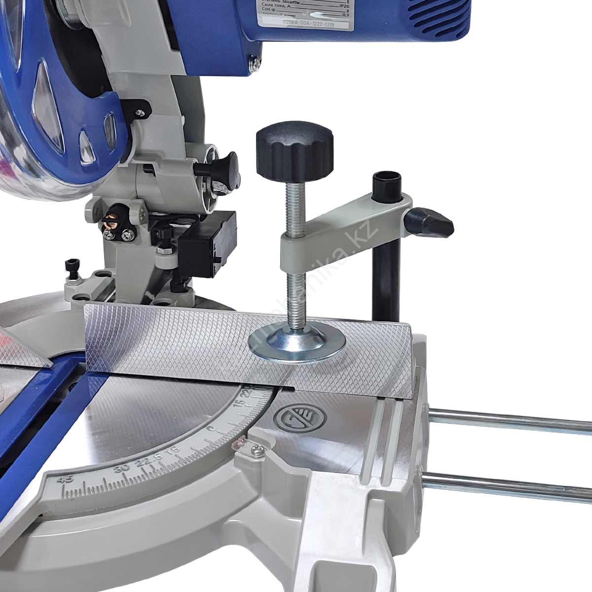 Для дополнительной точности реза предусмотрена лазерная направляющая. В комплекте есть упор с подвижной накладкой и струбцина для фиксации заготовки. Патрубок диаметром 42 мм для отвода отходов резания позволяет подключить вытяжное устройство.