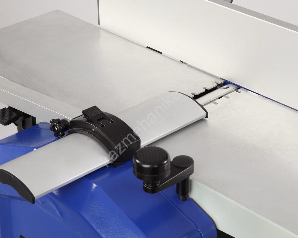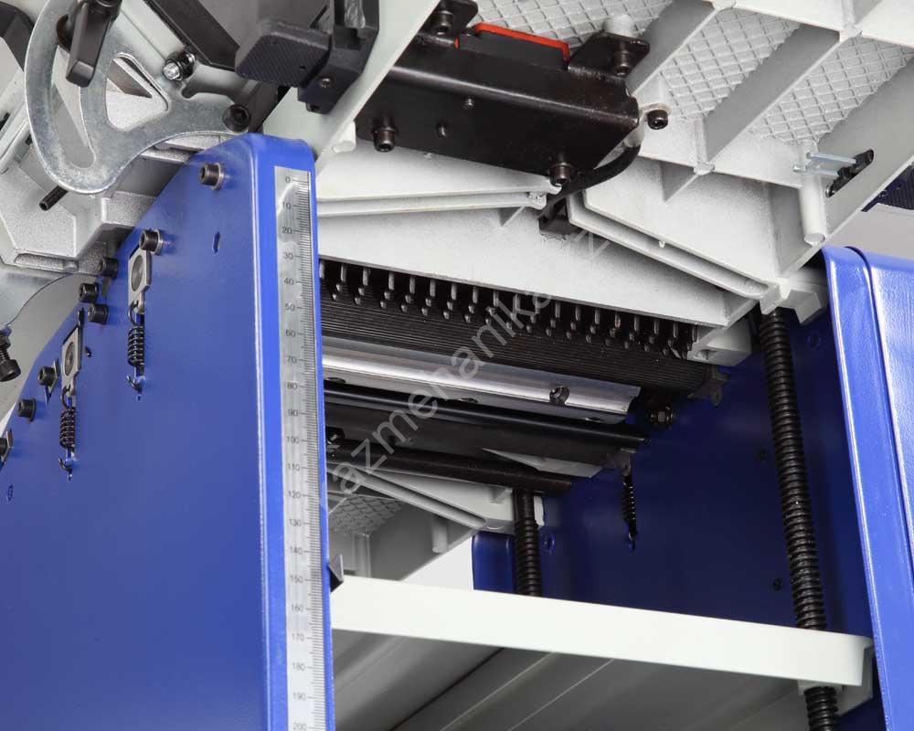При рейсмусовании подача заготовки происходит автоматически со скоростью 7 м/мин. Нижний рабочий стол выполнен также из стали, его размер 285×204 мм. Нужная высота рейсмусования настраивается с помощью рукоятки. Один полный оборот рукоятки равен 3 мм. Для удобства на станке имеется шкала. Рекомендуемая глубина реза при строгании и рейсмусовании составляет от 0,5 до 1,5 мм. При максимальной ширине рекомендуется обрабатывать заготовки на глубину не более 1,3 мм.
