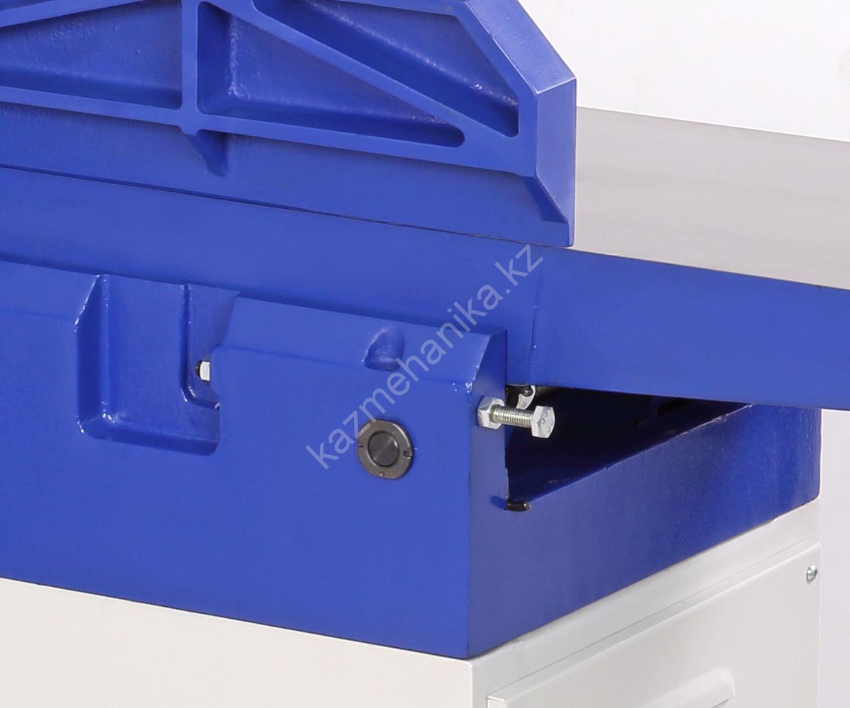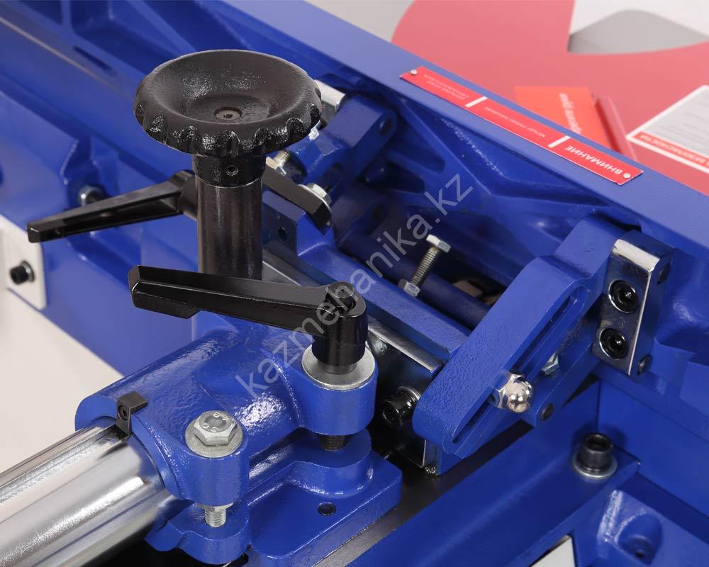 На станине из листовой сварной стали расположены литые чугунные элементы: основание, рабочие столы, параллельный упор с кареткой. Данная модель является одной из самых тяжелых – 350 кг.