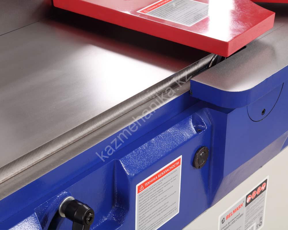 305 мм ширина обработки — самая большая среди станков BELMASH. Рабочие столы имеют общую длину 2240 мм, загрузочный 1036 мм, приемный 1036 мм. Длинные столы обеспечивают прямолинейность. Даже довольно габаритная заготовка, уложенная на них, будет иметь надежную опору. Оператору остается только перемещать ее в горизонтальной плоскости и немного прижимать к поверхности стола.
