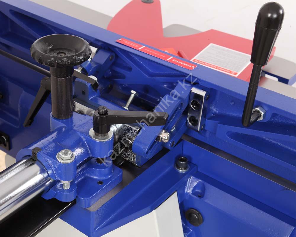 Размер параллельного упора 1186 × 136 мм, он позволяет осуществлять строгание под углом 90 и 45 градусов во внешнюю и внутреннюю стороны. Упор массивный, жесткий и надежный. Способ перемещения – реечный, более удобный механизм выставления угла.