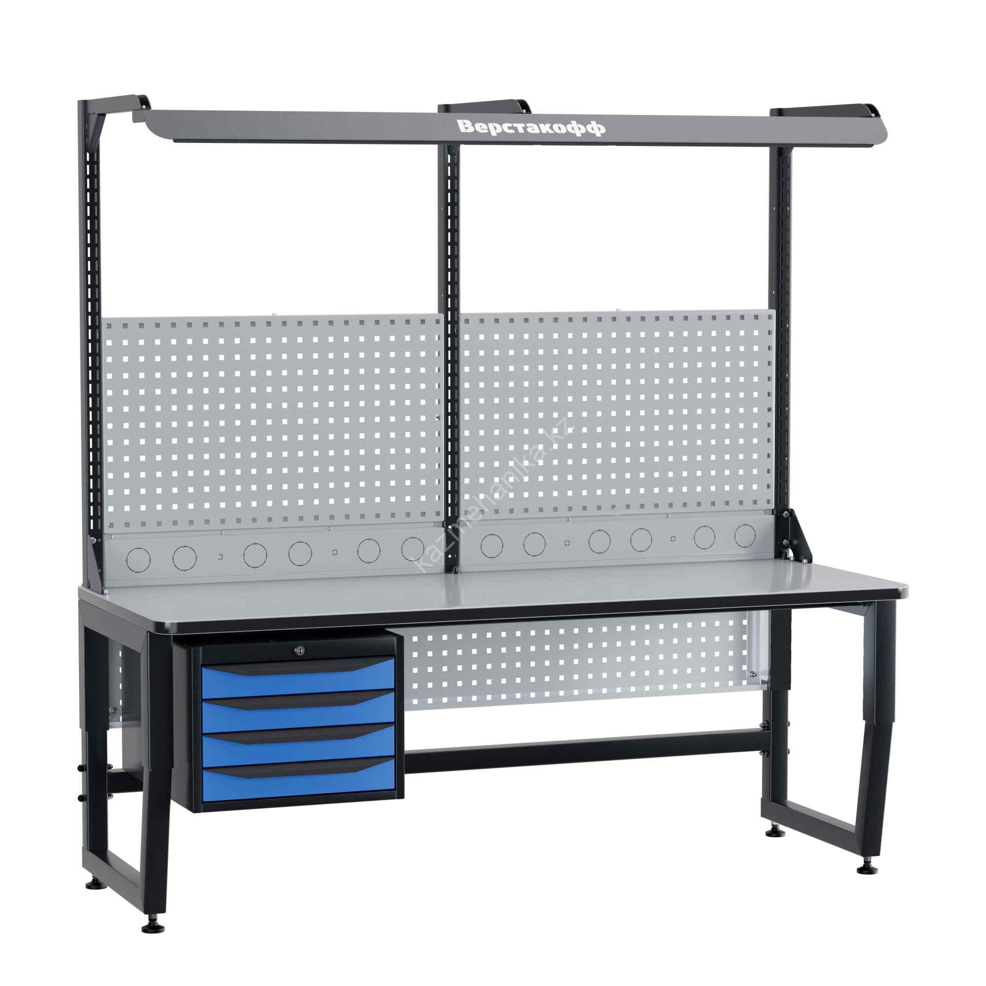 Цвет опор и каркасных элементов RAL 9011, цвет тумб: корпус и ручки ящиков RAL 9011, лицевые панели ящиков RAL 5023, перфопанель и блок коммуникаций RAL 7047, блок освещения RAL 9011. |