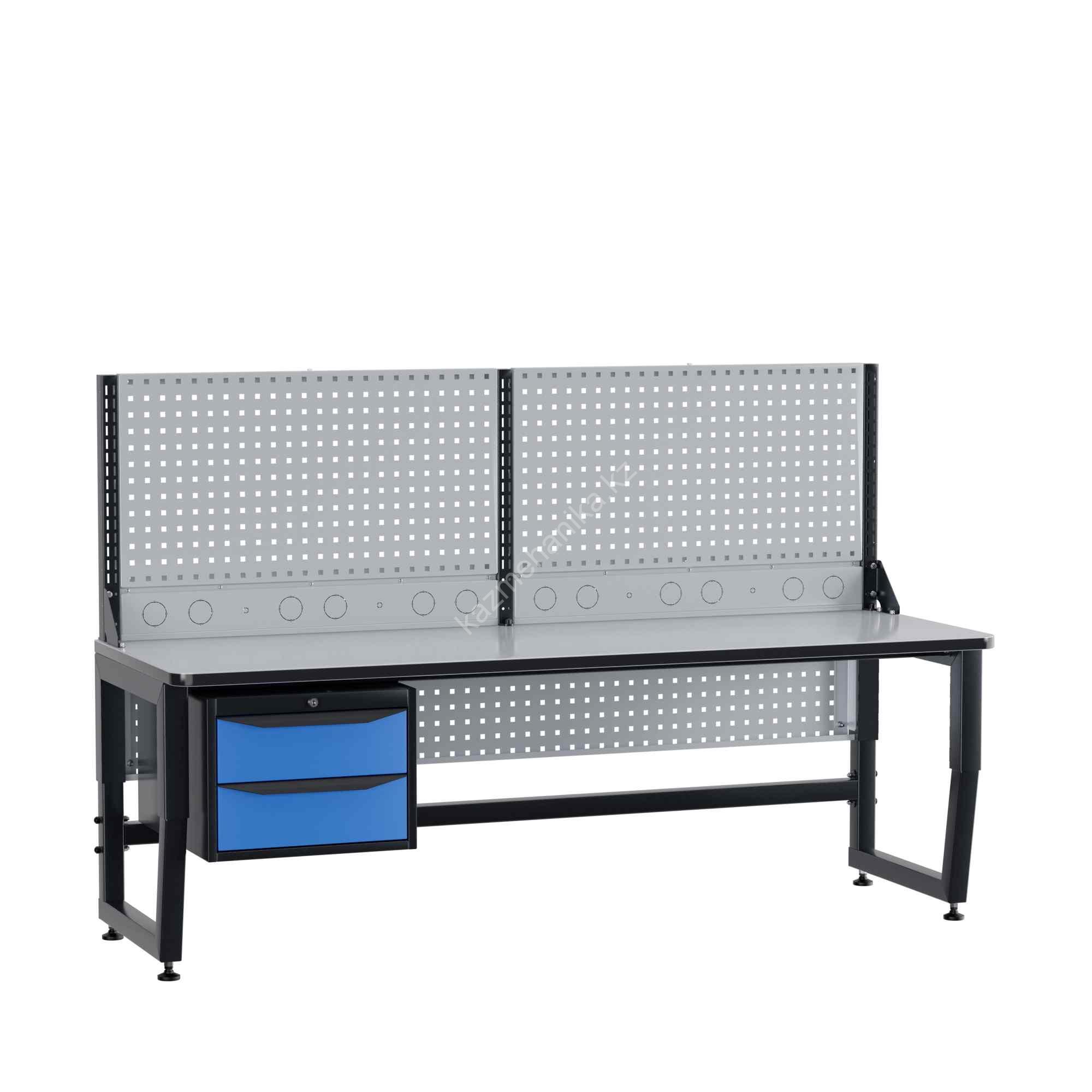 Цвет опор и каркасных элементов RAL 9011, цвет тумб: корпус и ручки ящиков RAL 9011, лицевые панели ящиков RAL 5023, перфопанель и блок коммуникаций RAL 7047, блок освещения RAL 9011. |