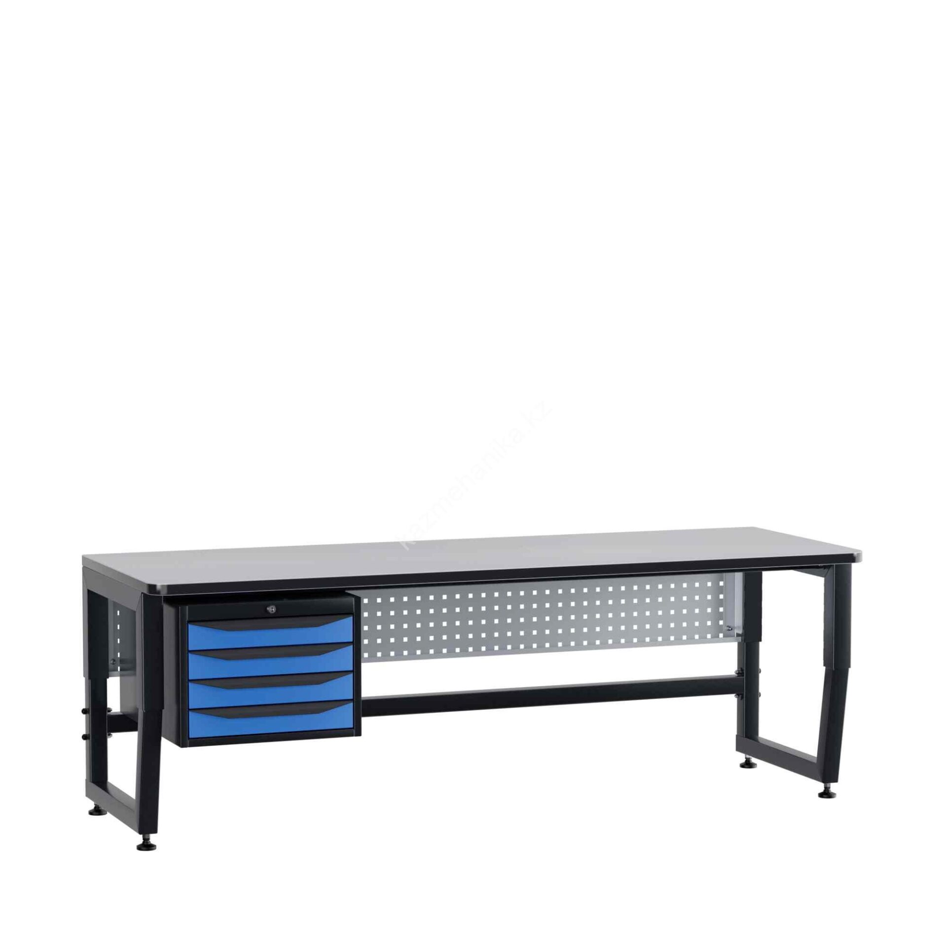 Цвет опор и каркасных элементов RAL 9011, цвет тумб: корпус и ручки ящиков RAL 9011, лицевые панели ящиков RAL 5023, перфопанель и блок коммуникаций RAL 7047, блок освещения RAL 9011. |