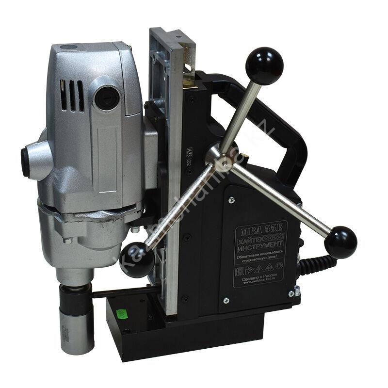 Новое поколение магнитного сверлильного станка MBA-55E характеризуется повышенной надежностью, прочностью, производительностью и коэффициентом полезного действия. Это компактный переносной инструмент для сверления отверстий в стальных балках, листах или трубах. Компания Хайтек инструмент производит данные сверлильные станки на собственных мощностях, используя при этом надежные электроприводы с цельнометаллическим корпусом и магнитную стойку, разработанные инженерами предприятия. Данный станок обладает низкой стоимостью, а производительность и надежность соответствуют требованиям заказчиков, привыкших работать с более дорогостоящими европейскими аналогами. Станок MBA-55E является отечественным изделием, с соответствующими преимуществами в цене и доступности. Технические характеристики: Диапазон сверления: — корончатым сверлом: 12-55 мм спиральным сверлом: 1-20 мм Ход подачи сверла: 145 мм Мощность двигателя: 1150 Вт Напряжение питания: 220 В Скорость на валу без нагрузки: 50-650 об/мин Стыковочный стандарт инструмента: Конус Морзе №2 В комплекте доп. держатель: Weldon 19 Прижимная сила магнита: 22 000 Н Масса без оснастки: 17 кг Стандартная комплектация: станок ящик страховочный ремень или цепь шестигранный ключ № 2.5 шестигранный ключ № 5 рукоятки – 3 шт. бачок СОЖ – 1 шт. трубка подачи СОЖ щетки угольные