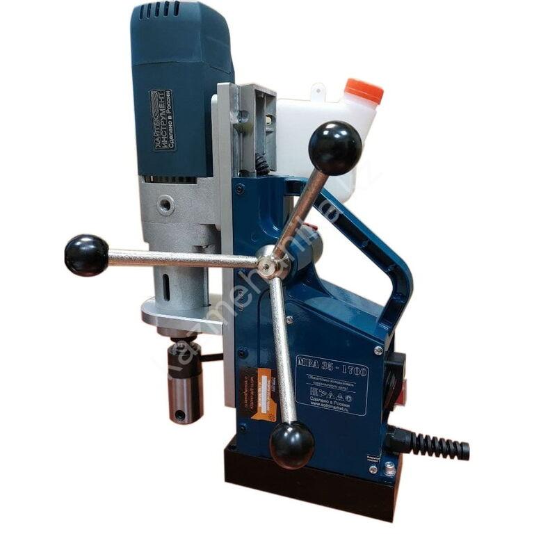 Магнитные сверлильные станки используются при изготовлении и монтаже металлоконструкций, при ремонте судов и крупных транспортных средств, при ремонте крупногабаритных станков. Магнитный сверлильный станок MBA-35-1700 оснащен новейшей моделью электропривода Резекненского Акционерного Общества REBIR увеличенной мощности. Впервые станок с конусом Морзе 2 и диапазоном сверления до 35 мм стал обладателем мотора такой мощности. 1700 Вт — это обычная мощность для станков с конусом Морзе 3 и возможностью сверления до 100 мм. Более того, электроприводы Rebir широко известны в России, запасные части к ним распространены и доступны по относительно невысоким ценам, что облегчает возможности ремонта в любых регионах России. Зачем на легком станке такой мощный электропривод? Как правило, наши конкуренты предлагают для сверления корончатыми сверлами 30-36 мм станки с мощностью привода 700-900 Вт. Этого достаточно. Но вы бы видели, что делается со станками на стоительных площадках и в цехах заводов. Не редкость, когда в станок заправляется обрезанное и проточенное на цилиндр спиральное сверло такого же диаметра, как максимально допустимое корончатое. Мы не сторонники подобных методов работы, но до тех пор, пока будут встречаться случаи такого проявления технологического бескультурия, станок МВА35-1700 будет востребован и полезен. При своей цене, массе и ремонтопригодности этот магнитный сверлильный станок сейчас вне конкуренции. Стандартная комплектация: сверлильный станок на электромагнитном основании держатель корончатого сверла Weldon19 с подводом СОЖ страховочная цепь или ремень клин для снятия оснастки патрон трехкулачковый с ключом, до 16 мм рукоятки гофрокороб бачок для подачи СОЖ с трубкой Дополнительная информация: Диапазон сверления: — спиральным сверлом: до16 мм корончатым сверлом: до 35 мм ход подачи сверла: 140 мм мощность двигателя: 1700 Вт скорость на валу без нагрузки: 650 об/мин прижимная сила магнита: 20 000 Н масса без оснастки: 13 кг ИЩЕТЕ МАГНИТНЫЙ СТАНОК ПОДЕШЕВЛЕ? ЖМИТЕ СЮДА!