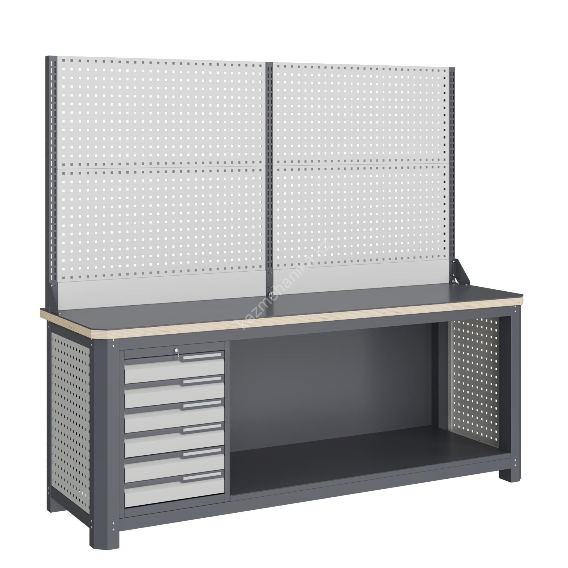 Верстак серии MECHANIC: MCN 2052.S6.111-2 состоит из столешницы шириной 1993 мм, рамы верстака, состоящей из опор, перемычек, боковых перфопанелей, малого модуля S6 и трех комплектов полка-стенка SW1, двойного экрана с кронштейнами. Предназначен для выполнения сборочных, ремонтных, слесарных, монтажных и других видов работ на производстве, в сервисных центрах, мастерских, гаражах.