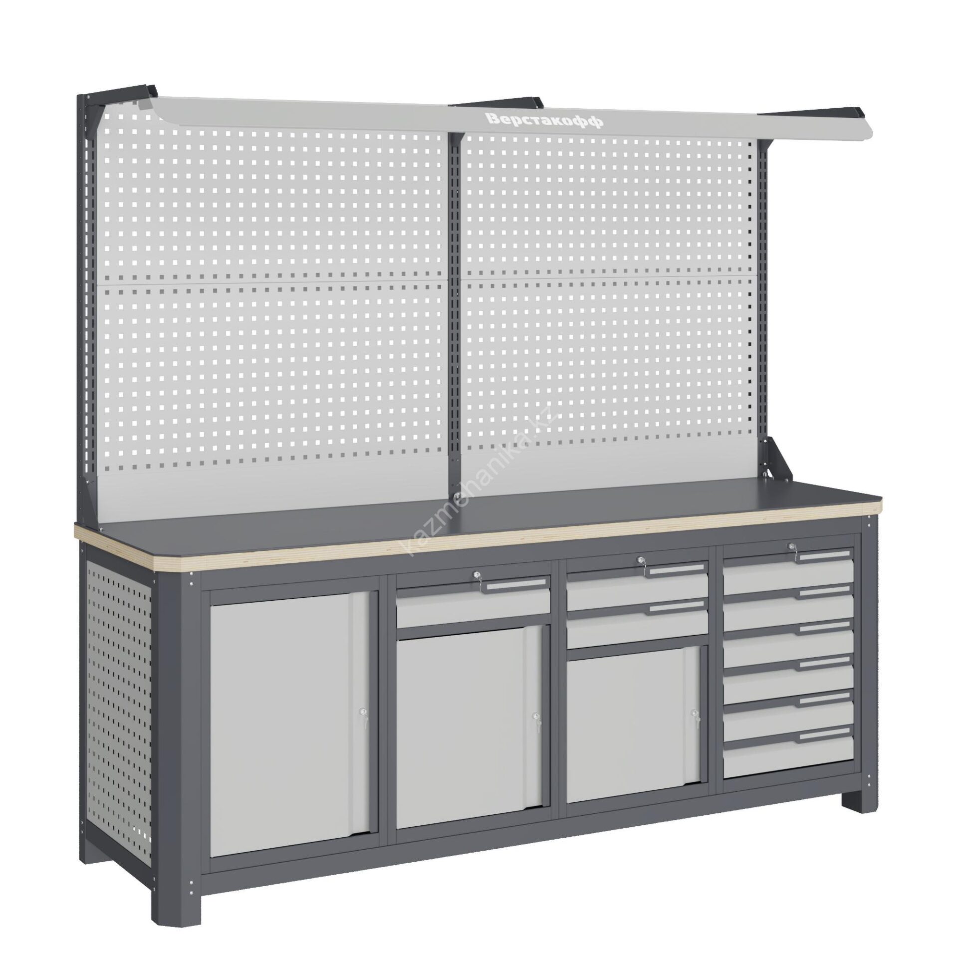 Верстак серии MECHANIC: MCN 2052.S6789-2F состоит из столешницы шириной 1993 мм, рамы верстака, состоящей из опор, перемычек, боковых перфопанелей, малых модулей S6, S7, S8 и S9, двойного экрана с кронштейнами и комплектом освещения. Предназначен для выполнения сборочных, ремонтных, слесарных, монтажных и других видов работ на производстве, в сервисных центрах, мастерских, гаражах.