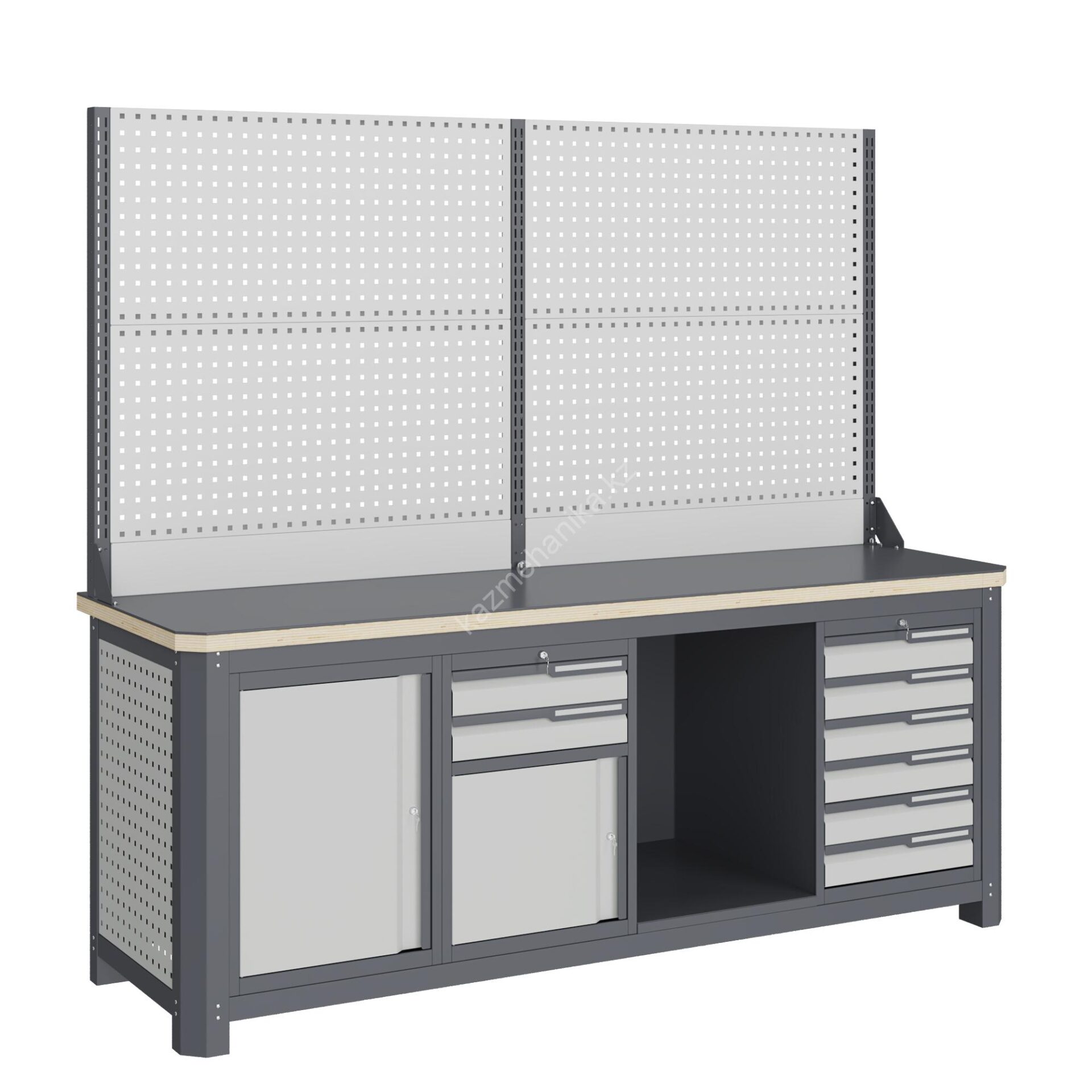 Верстак серии MECHANIC: MCN 2052.S679.1-2 состоит из столешницы шириной 1993 мм, рамы верстака, состоящей из опор, перемычек, боковых перфопанелей, малых модулей S6, S7, S9 и комплекта полка-стенка SW1, двойного экрана с кронштейнами. Предназначен для выполнения сборочных, ремонтных, слесарных, монтажных и других видов работ на производстве, в сервисных центрах, мастерских, гаражах.
