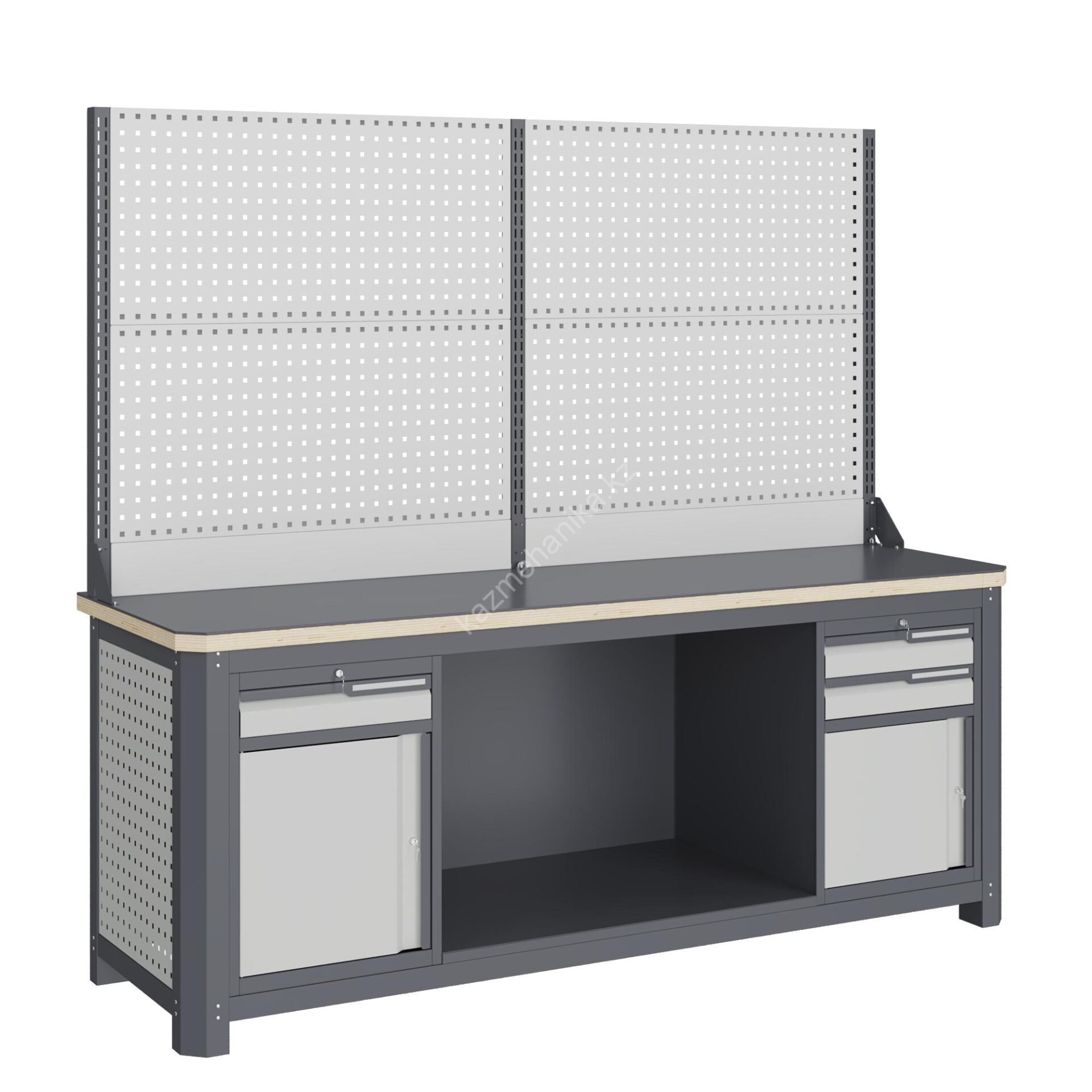Верстак серии MECHANIC: MCN 2052.2052.S89.11-2 состоит из столешницы шириной 1993 мм, рамы верстака, состоящей из опор, перемычек, боковых перфопанелей, малых модулей S8, S9 и двух комплектов полка-стенка SW1, двойного экрана с кронштейнами. Предназначен для выполнения сборочных, ремонтных, слесарных, монтажных и других видов работ на производстве, в сервисных центрах, мастерских, гаражах.