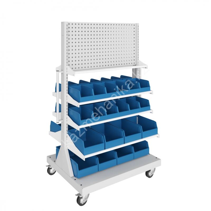 Комбинированная мобильная стойка с перфорированными панелями для инструментов и пластиковыми контейнерами для метизов, креплений и ЗИП.