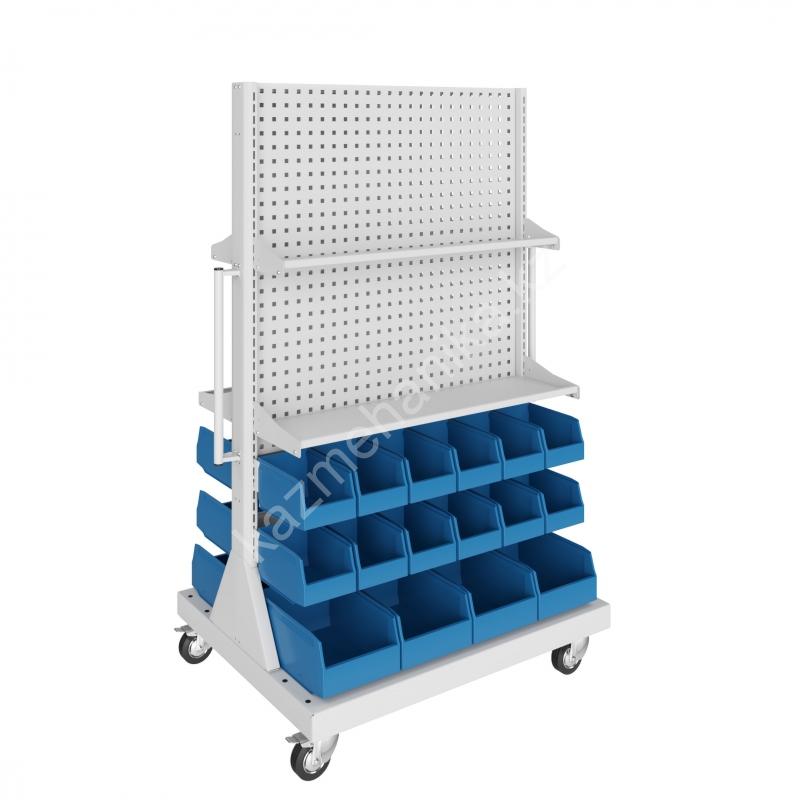 Комбинированная мобильная стойка с перфорированными панелями для инструментов и пластиковыми контейнерами для метизов, креплений и ЗИП.