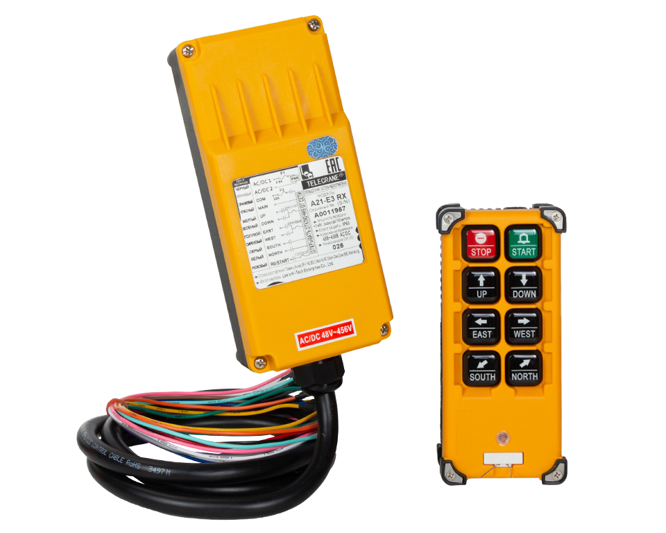 Радиоуправление «Telecrane» А21-Е3B, комплект (Пульт 6 кнопок управления + старт +стоп, 1 скорость + Приемник) (Питание приемника: 220/380 В) Внимание! Не допускается использование нескольких комплектов в одном месте с одинаковыми каналами