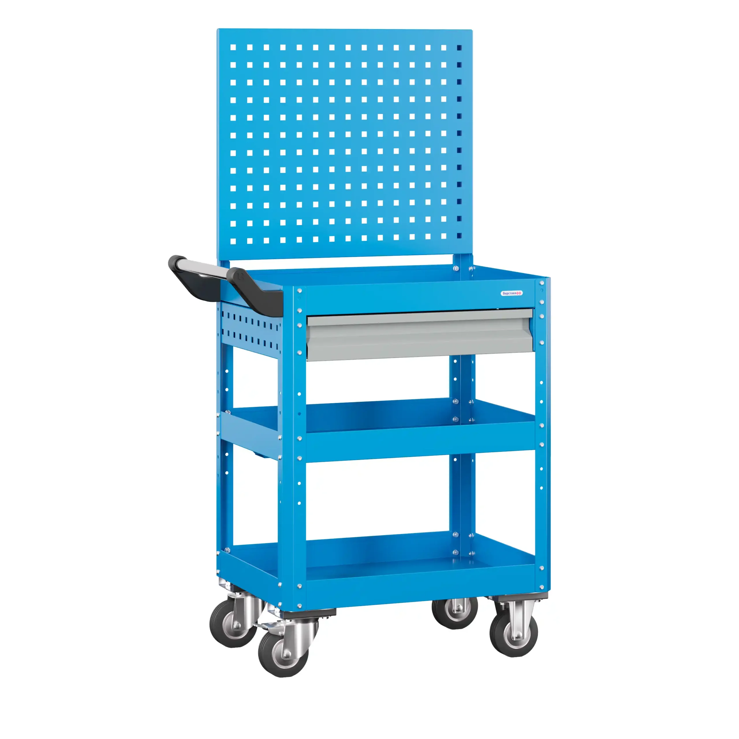 С перфорированной панелью для навесных элементов и выдвижным ящиком на шариковых телескопических направляющих. Общая равномерно-распределённая нагрузка на тележку — до 100кг. Корпус выполнен из листовой стали толщиной от 0,6 до 1,5мм., покрыт полимерной порошковой краской. Верхняя и средняя полка имеют высоту борта 40мм., нижняя полка имеет высоту борта 60мм