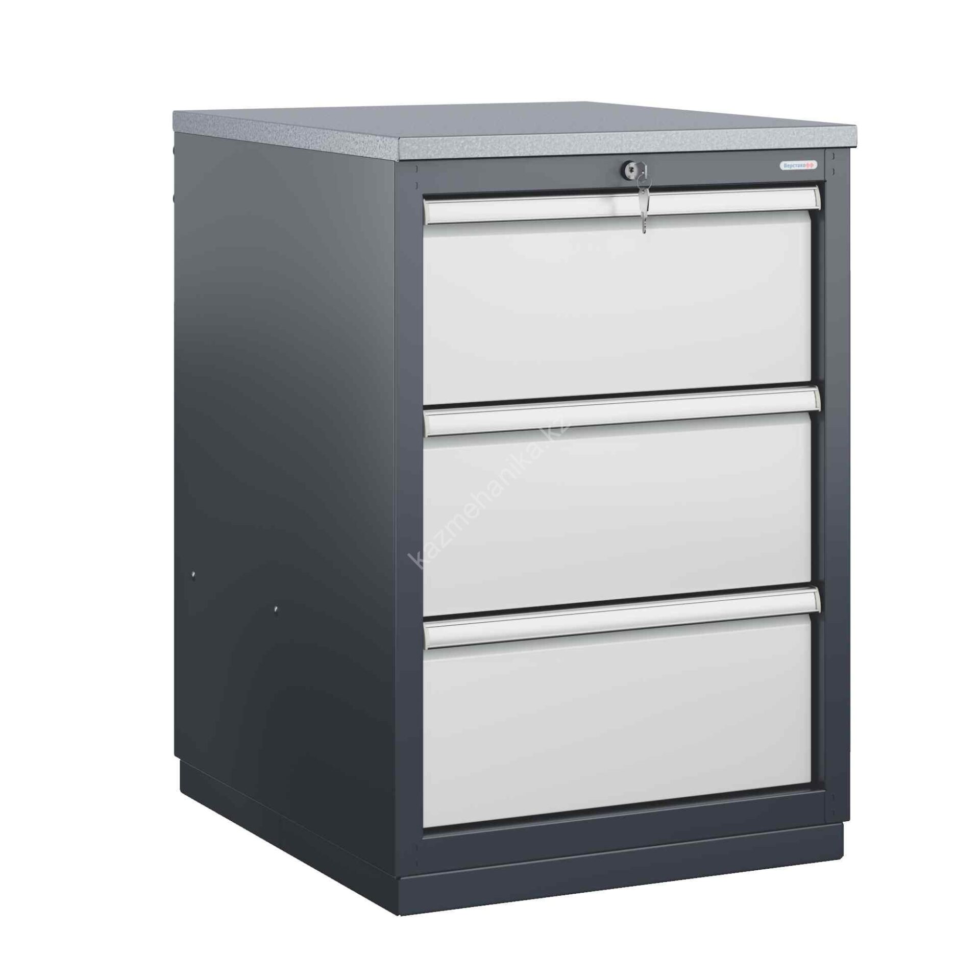 Тумба G3 — Тумба с 3-я выдвижными ящиками высотой 228 мм, внутренние размеры ящиков (ВхШхГмм) 190х460х500, фактические размеры корпуса тумбы (ВхШхГмм): 825х580х660. Система антиопрокидывания, нагрузка на ящик 100кг.