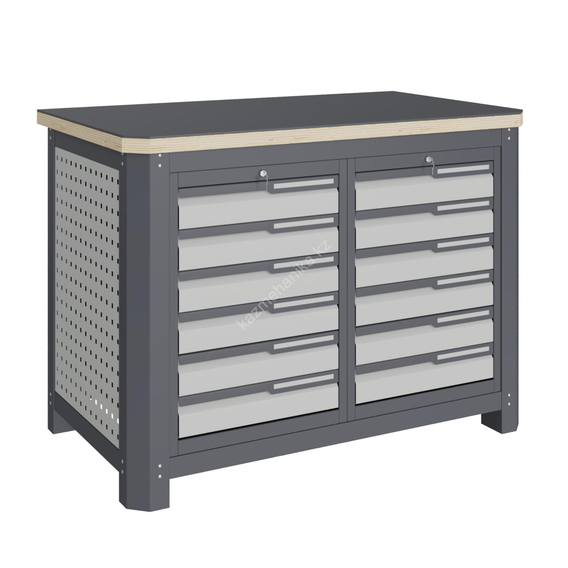 Рабочее место MECHANIC: MCN 1252.S66 состоит из столешницы шириной 1193 мм, рамы верстака, состоящей из опор, перемычек, боковых перфопанелей, двух небольших модулей с ящиками S6.