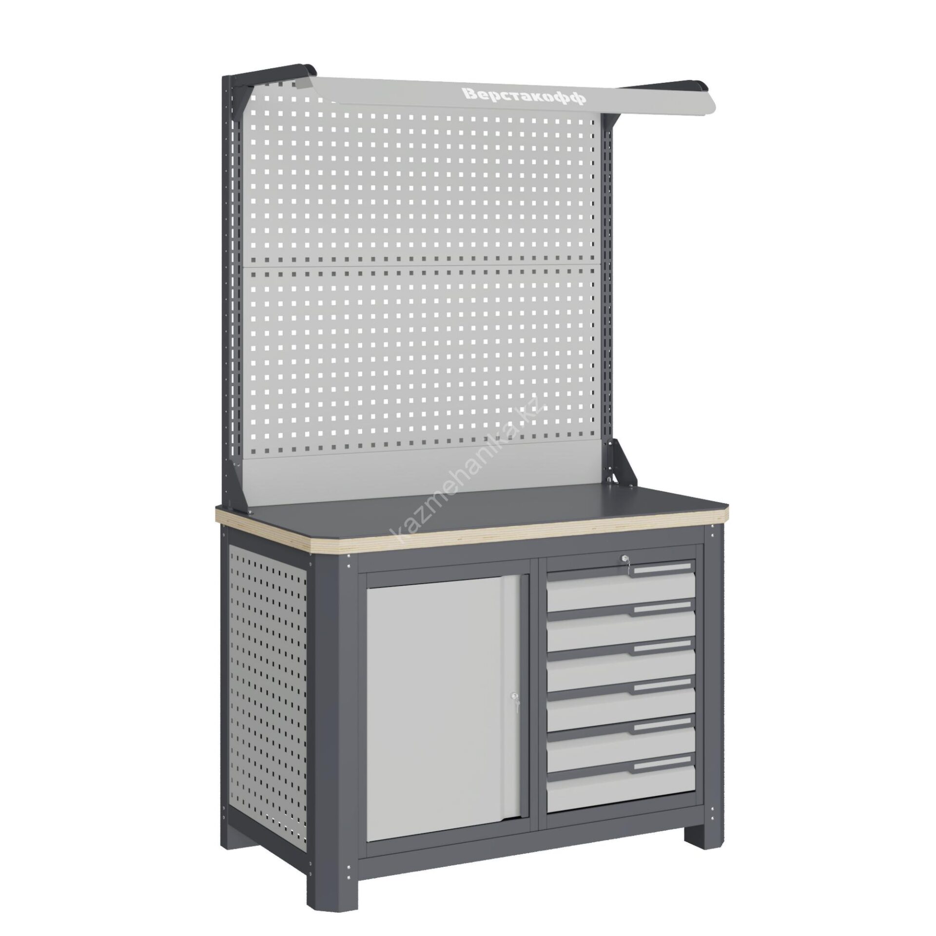 Рабочее место MECHANIC: MCN 1252.S67-2F состоит из столешницы шириной 1193 мм, рамы верстака, состоящей из опор, перемычек, боковых перфопанелей, небольшого модуля с ящиками S6 и модуля S7 ( c дверцей), двойной экрана с кронштейнами и комплектом освещения. Предназначен для выполнения сборочных, ремонтных, слесарных, монтажных и других видов работ на производстве, в сервисных центрах, мастерских, гаражах.
