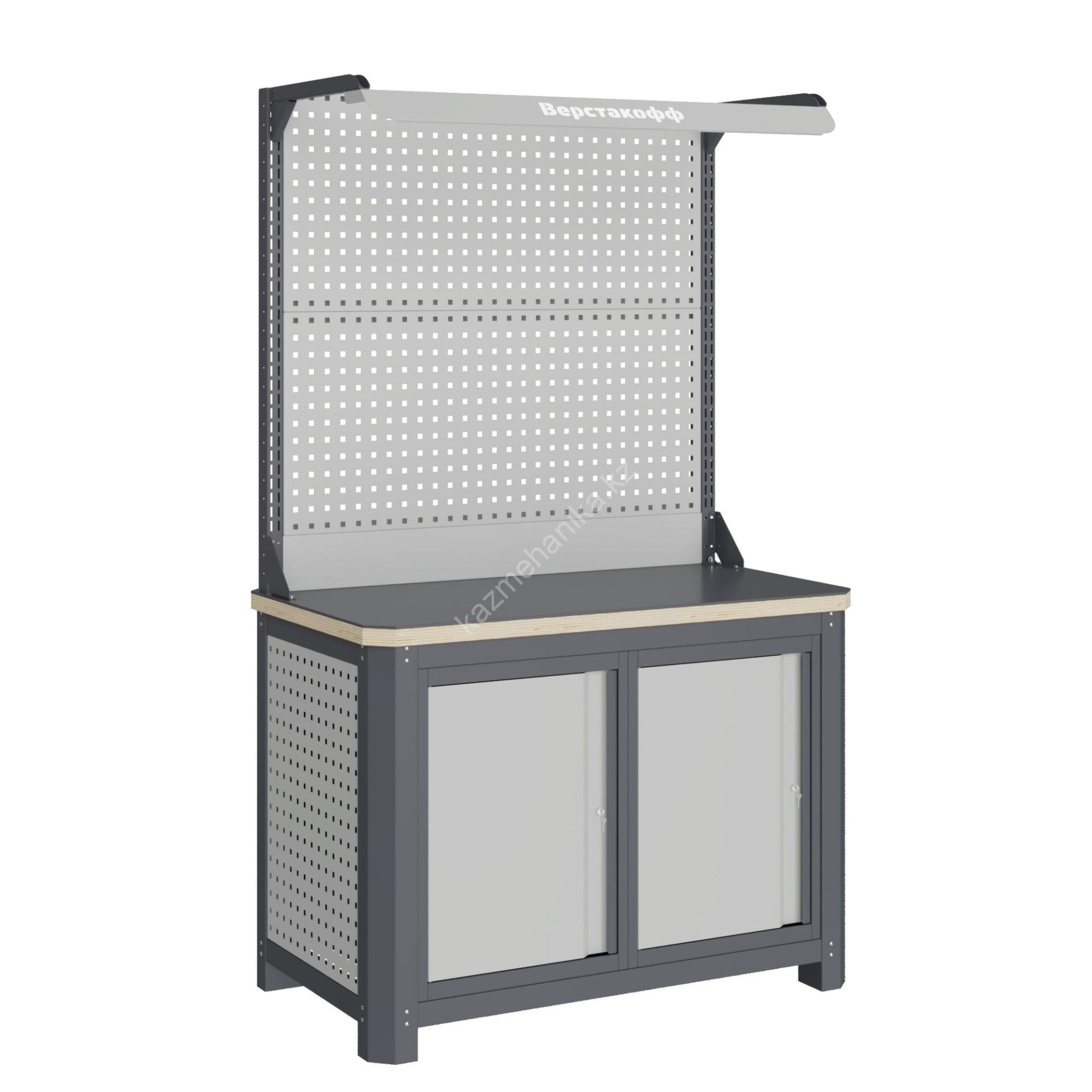 Рабочее место MECHANIC: MCN 1252.S77-2F состоит из столешницы шириной 1193 мм, рамы верстака, состоящей из опор, перемычек, боковых перфопанелей, двух небольших модулей S7 (модуль с дверцей), двойной экран с кронштейнами и комплектом освещения. Предназначен для выполнения сборочных, ремонтных, слесарных, монтажных и других видов работ на производстве, в сервисных центрах, мастерских, гаражах.