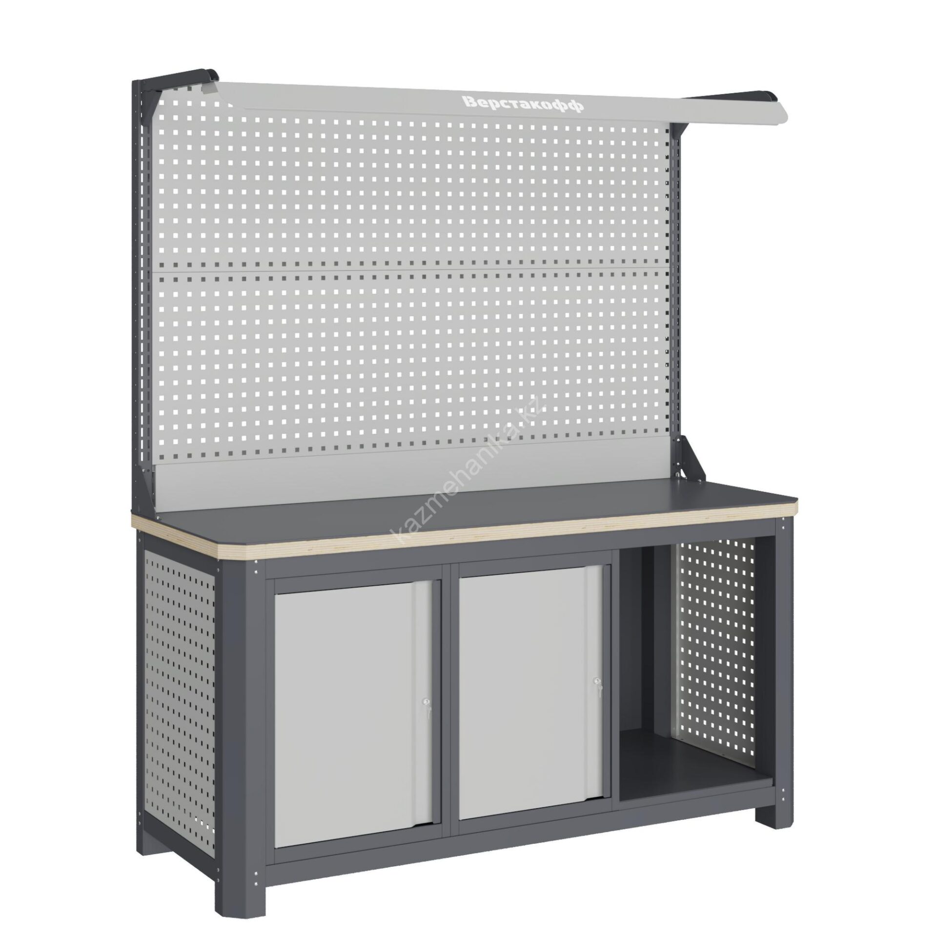 Верстак серии MECHANIC: MCN 1552.S77.1-2F состоит из столешницы шириной 1493 мм, рамы верстака, состоящей из опор, перемычек, боковых перфопанелей, малых модулей S7 и комплекта полка-стенка SW1, двойного экрана с кронштейнами с комплектом освещения. Предназначен для выполнения сборочных, ремонтных, слесарных, монтажных и других видов работ на производстве, в сервисных центрах, мастерских, гаражах.