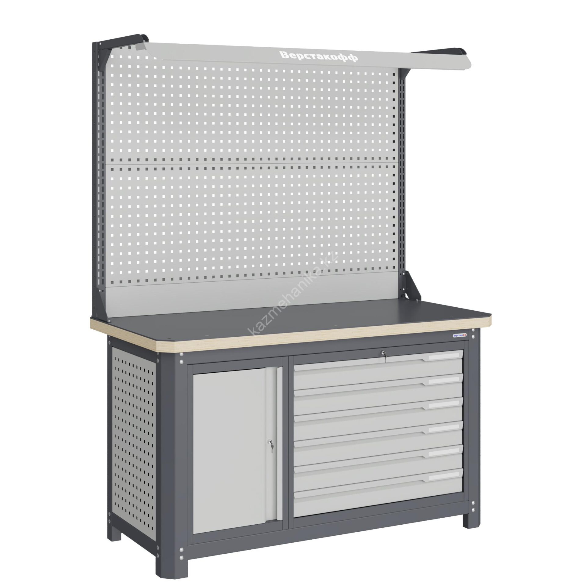 Верстак серии MECHANIC: MCN 1552.S7L6-2F состоит из столешницы шириной 1493 мм, рамы верстака, состоящей из опор, перемычек, боковых перфопанелей, малого модуля S7, большого модуля L6, двойного экрана с кронштейнами и комплекта освещения. Предназначен для выполнения сборочных, ремонтных, слесарных, монтажных и других видов работ на производстве, в сервисных центрах, мастерских, гаражах.
