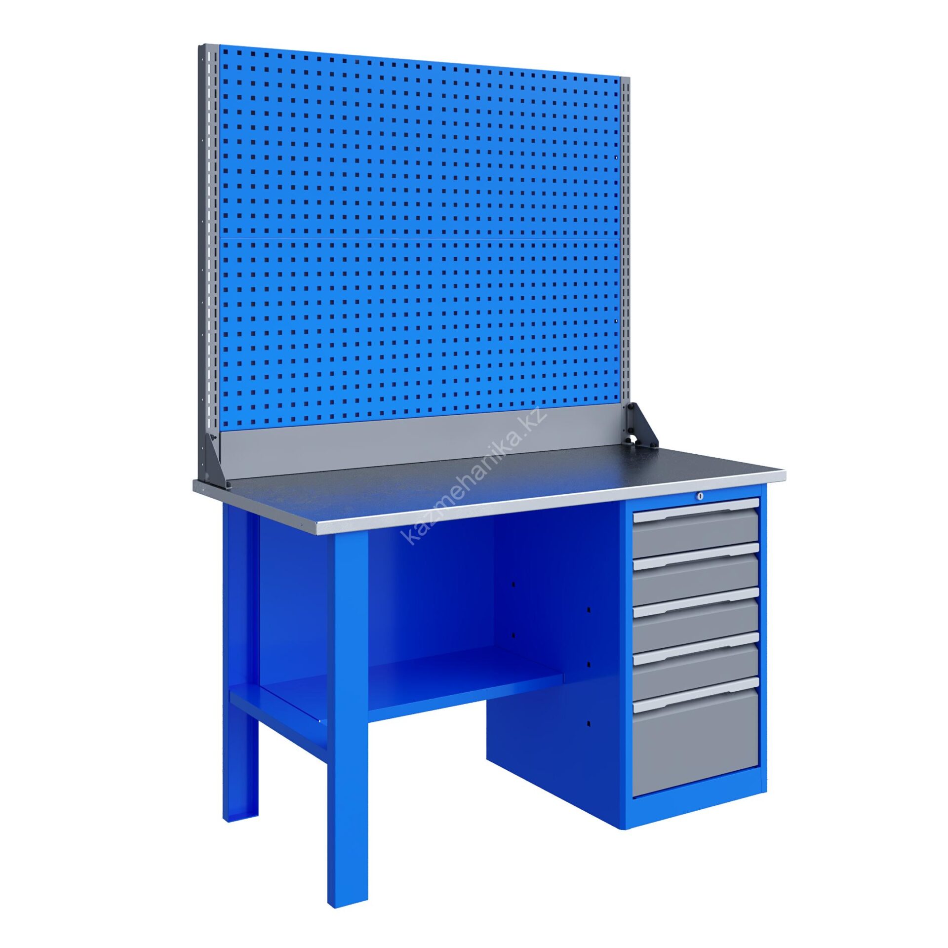 Верстак серии Technic 141.15.2-2 состоит из столешницы шириной 1396 мм, опоры, тумбы P5 с четырьмя малыми и одним большим ящиком, полки-стенки, двойного экрана с кронштейнами.