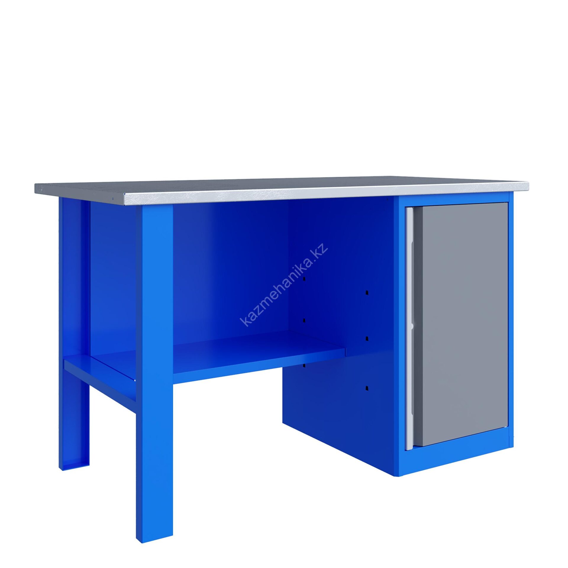 Верстак серии Technic 141.17.2 состоит из столешницы шириной 1396 мм, опоры, тумбы P7 с дверью и двумя полками и полки-стенки.