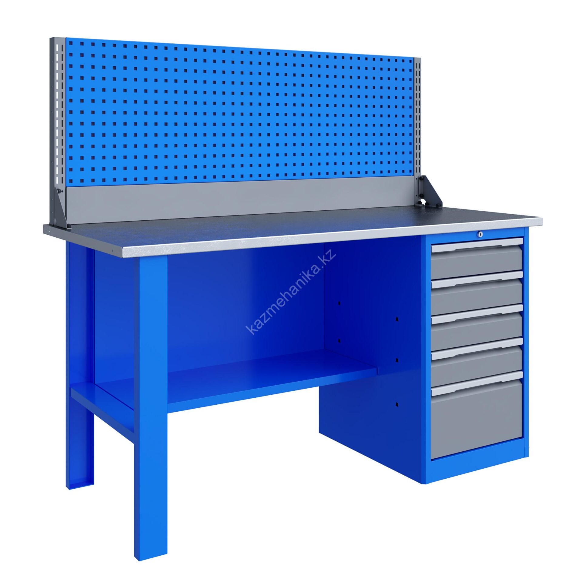 Верстак серии Technic 161.15.3-1 состоит из столешницы шириной 1596 мм, опоры, тумбы P5 с четырьмя малыми и одним большим ящиком, полки-стенки и одинарного экрана с кронштейнами.
