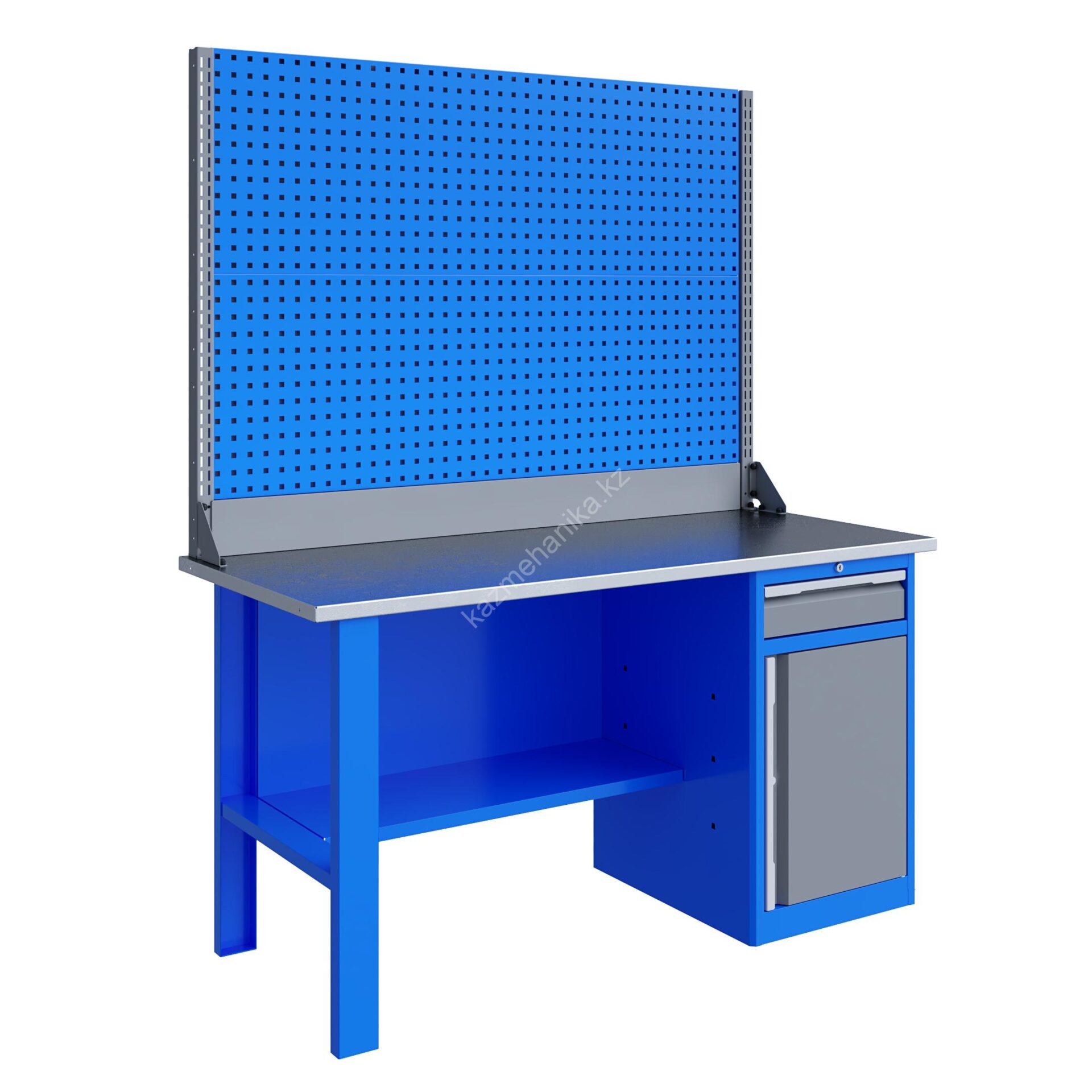 Верстак серии Technic 161.18.3-2 состоит из столешницы шириной 1596 мм, опоры, тумбы P8 с малым ящиком и отделением с дверью и одной полкой, полки-стенки, двойного экрана с кронштейнами.